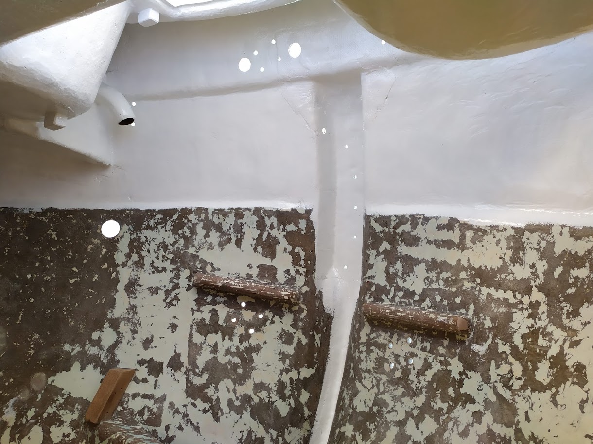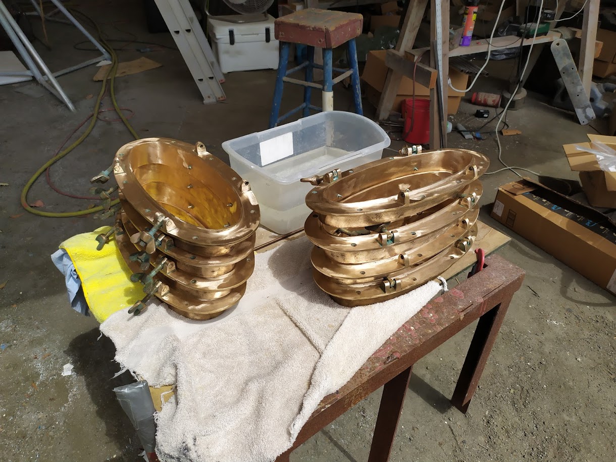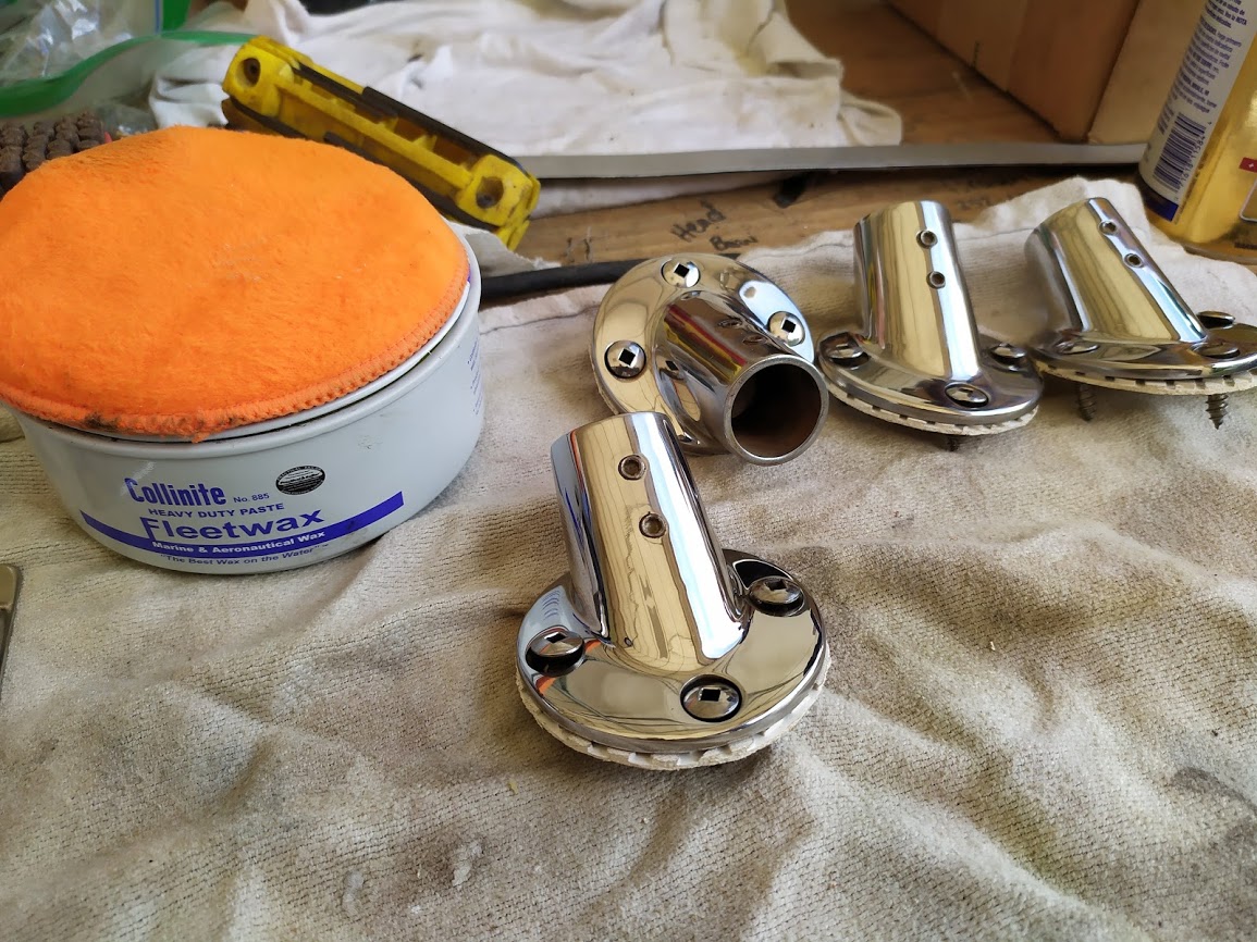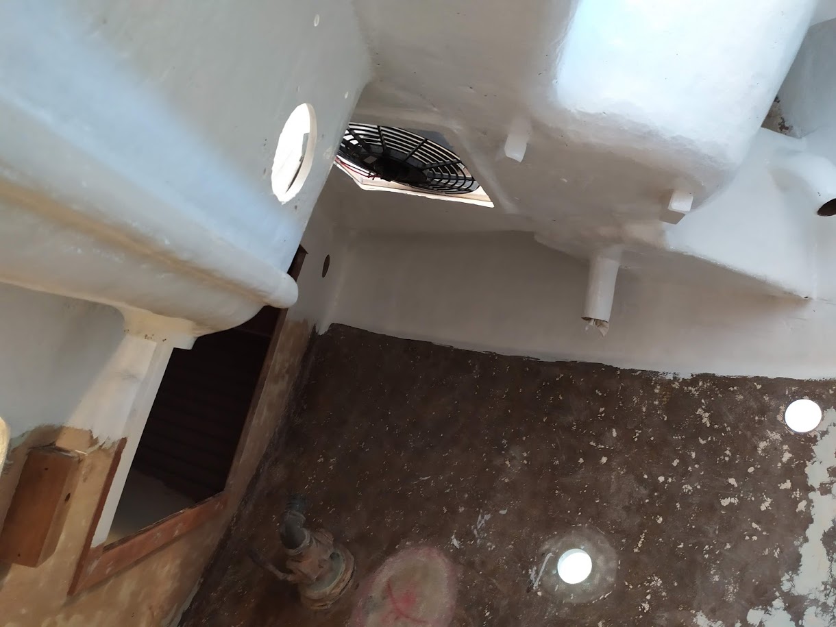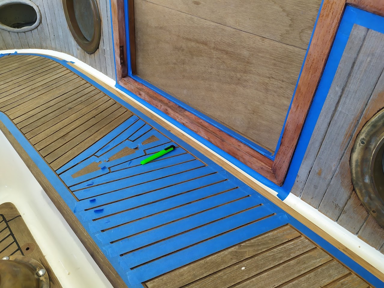 But before we could start on the paint, we needed to finish the port light holes. Yes, we did 99% of all work needed to the holes before we painted the inside, but we had not yet dry fitted them back into the new holes, nor had we cleaned them up. We also dry fitted the windlass bracket and dive compressor box and removed the teak eyebrow.
