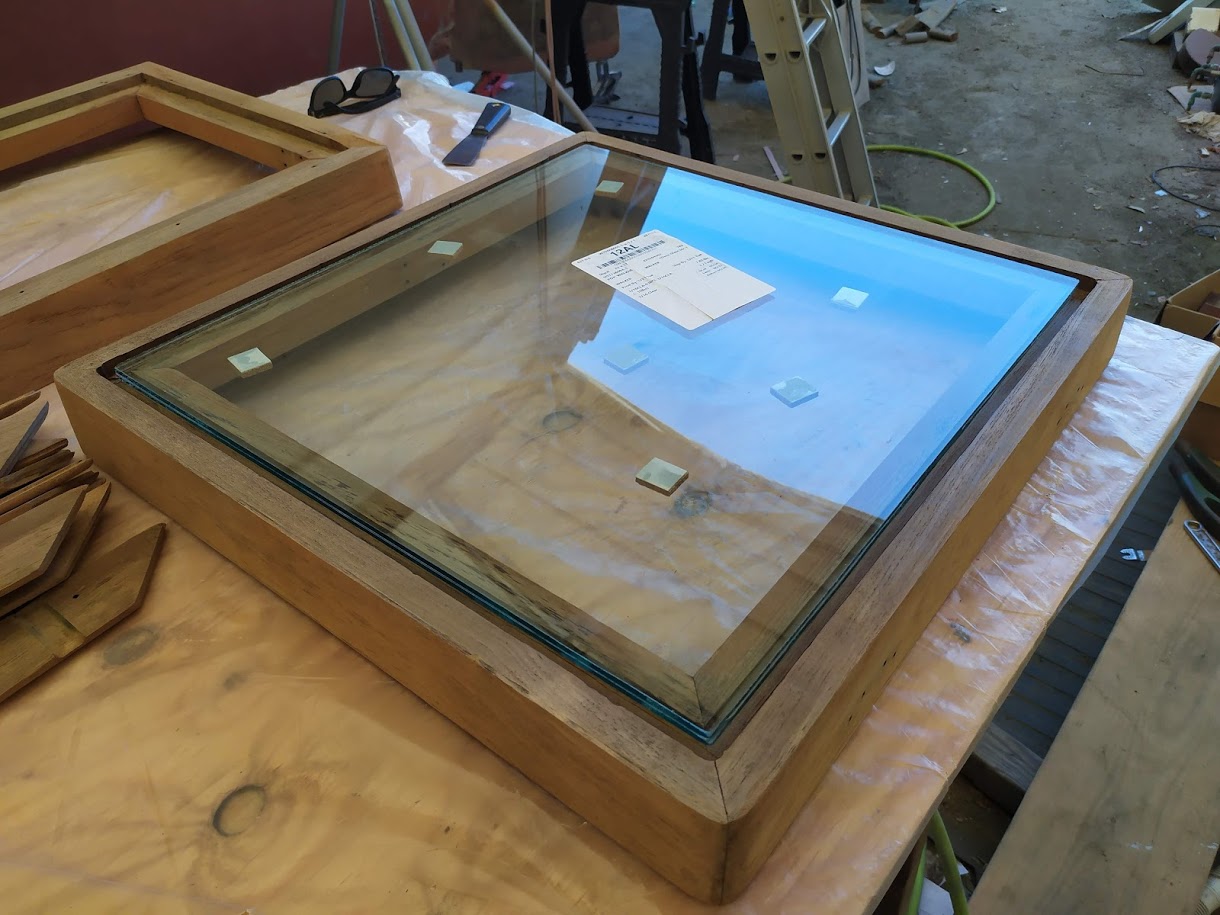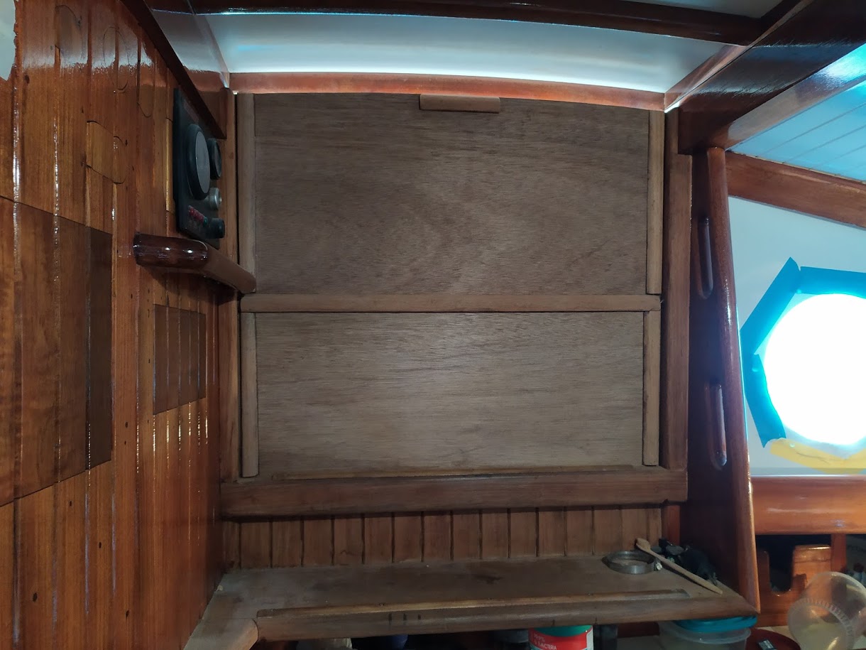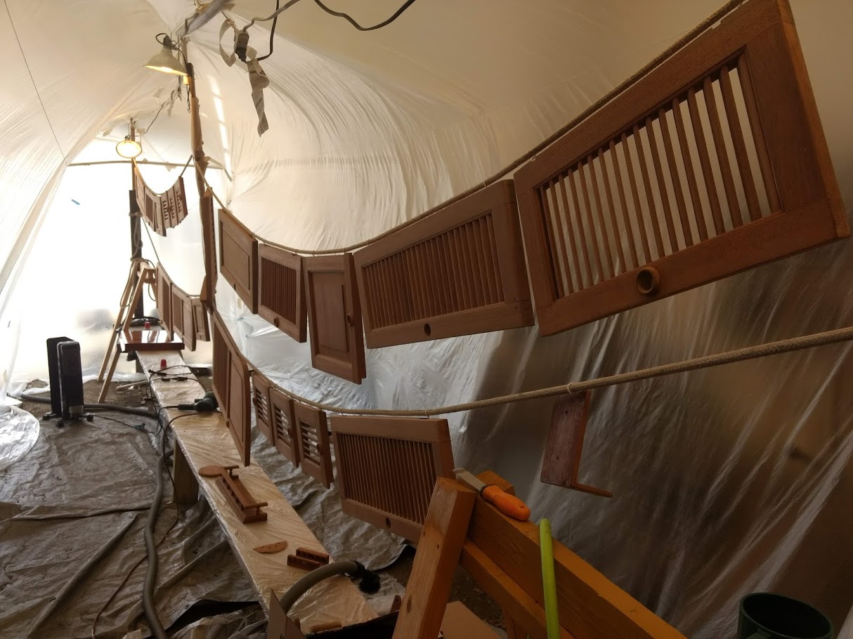 While we are applying the varnish in the bubble, we have to keep in mind that the temperatures are very low, so we had to use all the tricks in the book in order for it to dry happily. And because of the temps, the varnish took a little longer than normal to dry, so we would stay busy with installing hardware back inside the boat like hinges and what not.