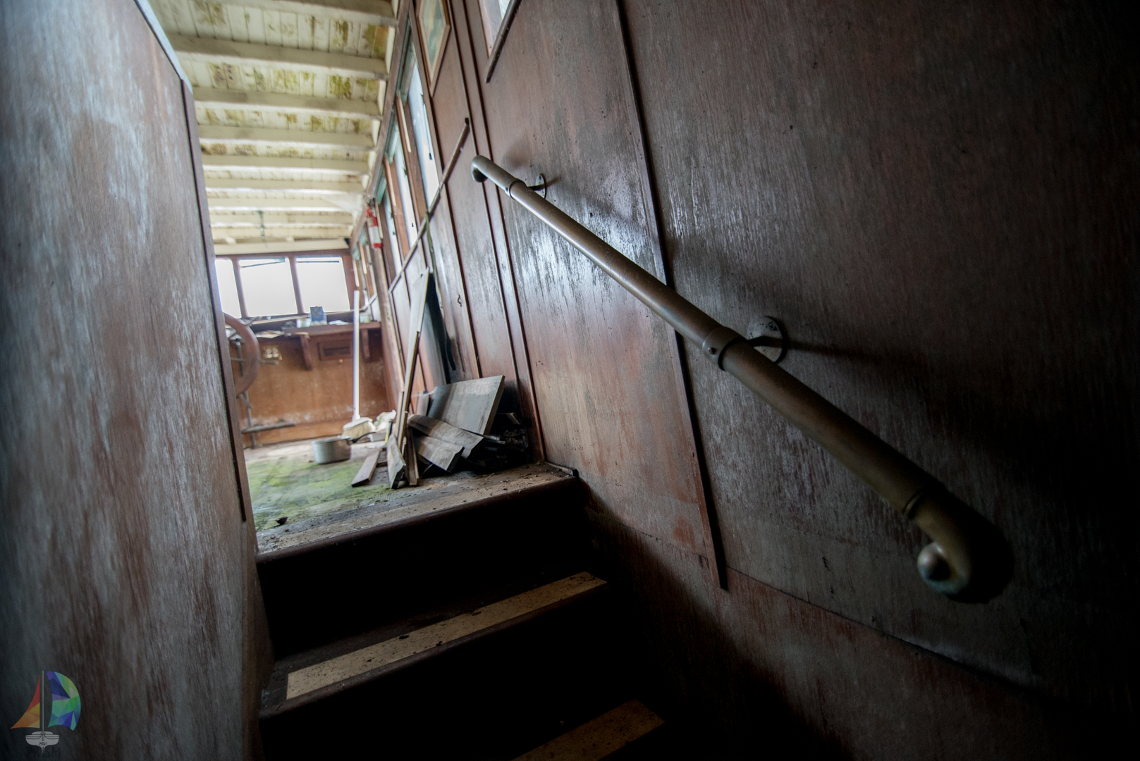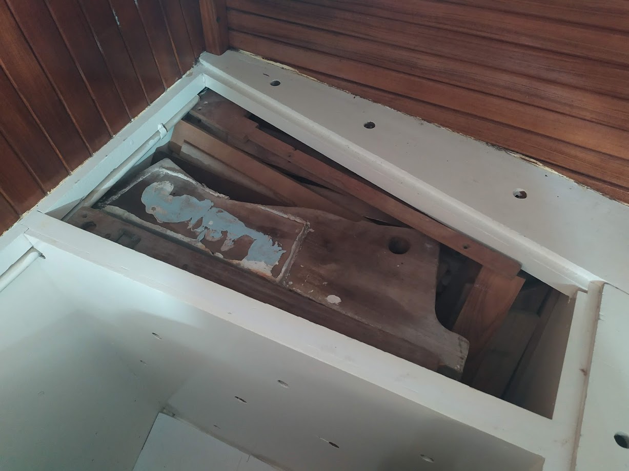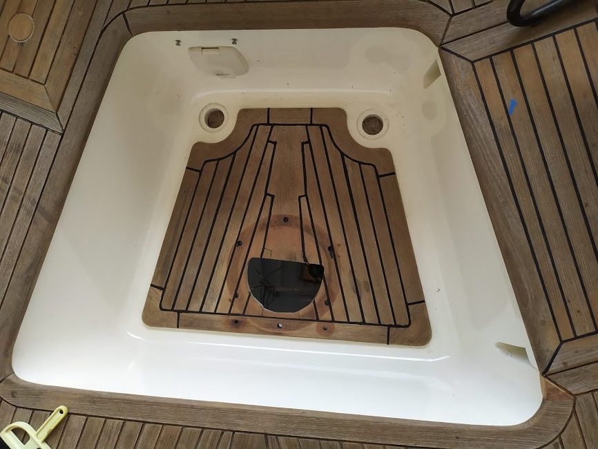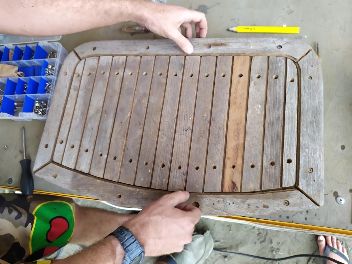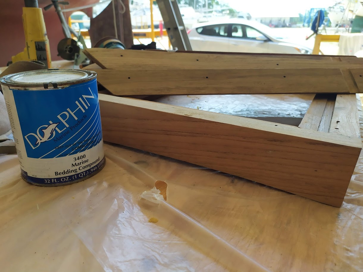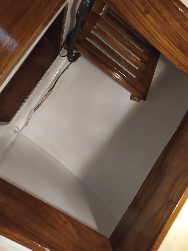 Jon also added another project that has been on the list for along time, the top step. The top step aboard Prism is also our engine cover and a storage shelf. It was weak and falling apart and needed more support to accept the weight that grown adults put on it. So he completely redesigned the structure and brought the old battered teak back to life.