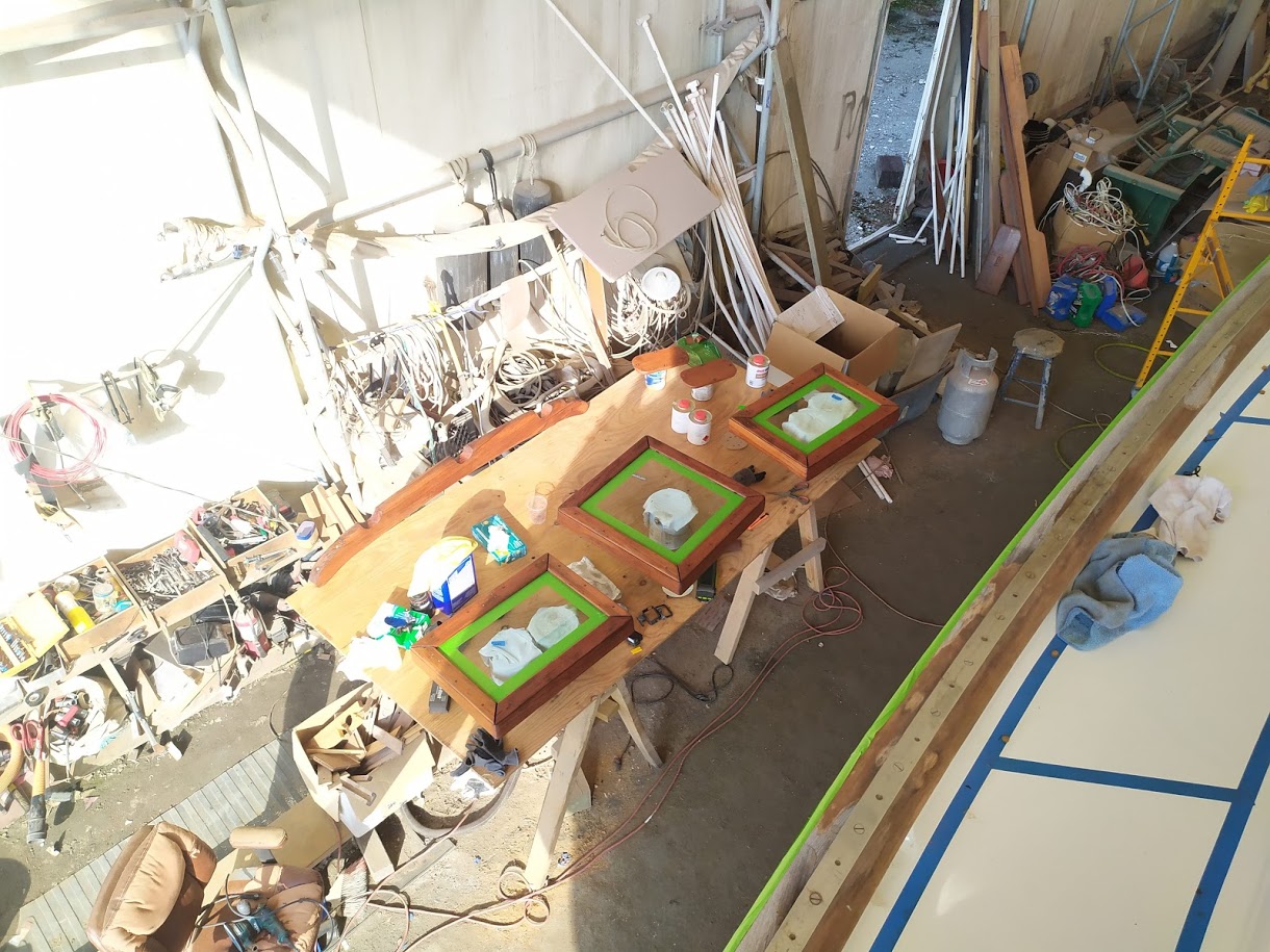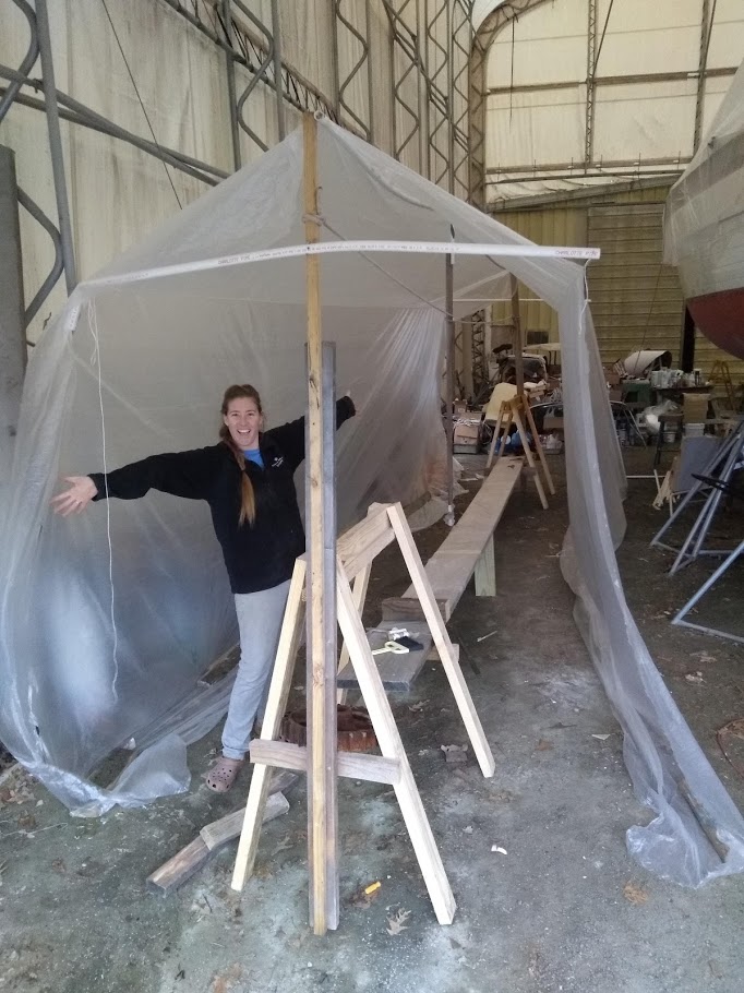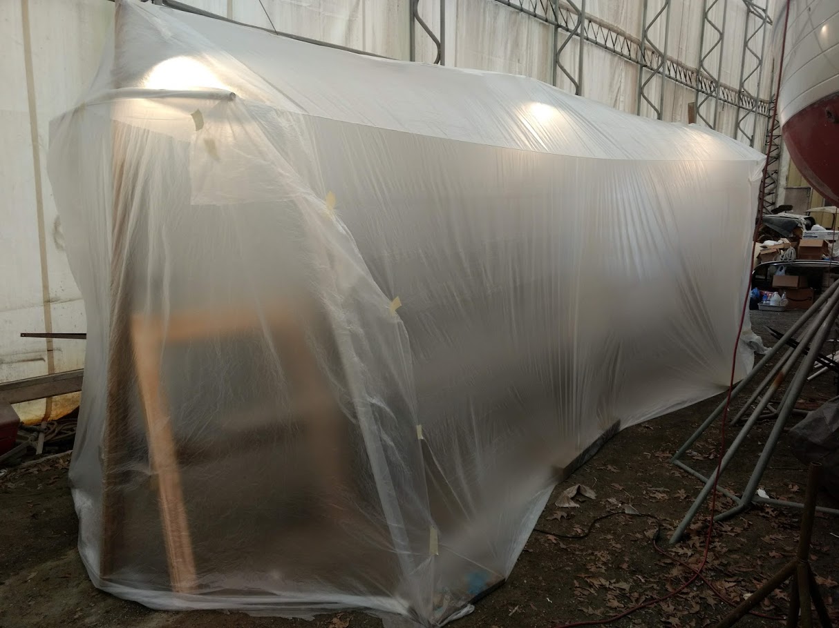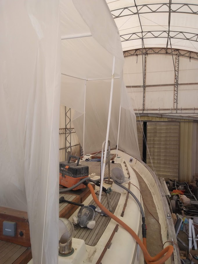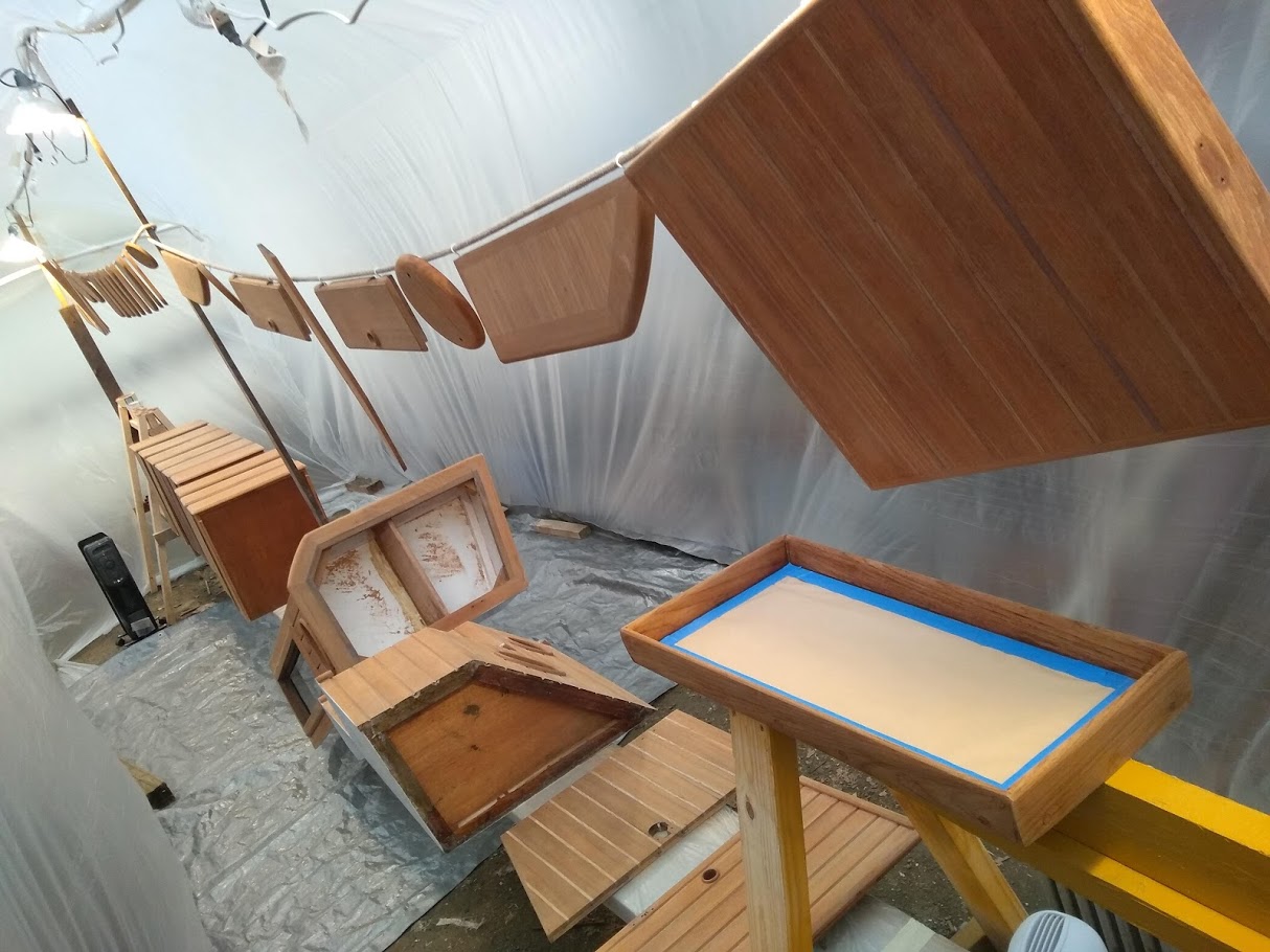 This time around we are spraying the ACE Spar varnish on all the teak that can be removed and brought down to our newly built spray booth. AKA another bubble.
