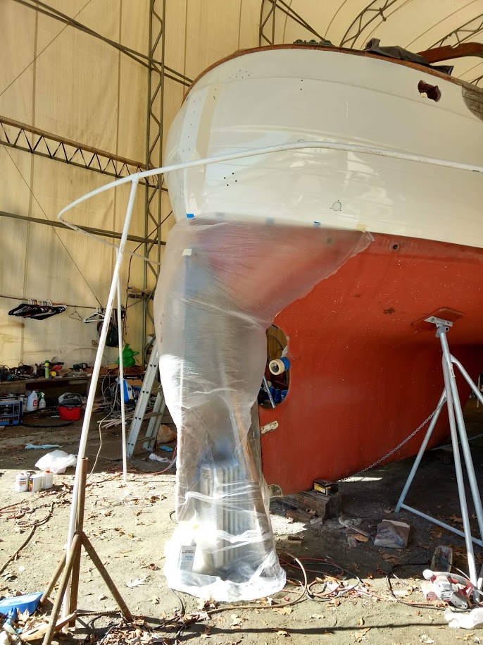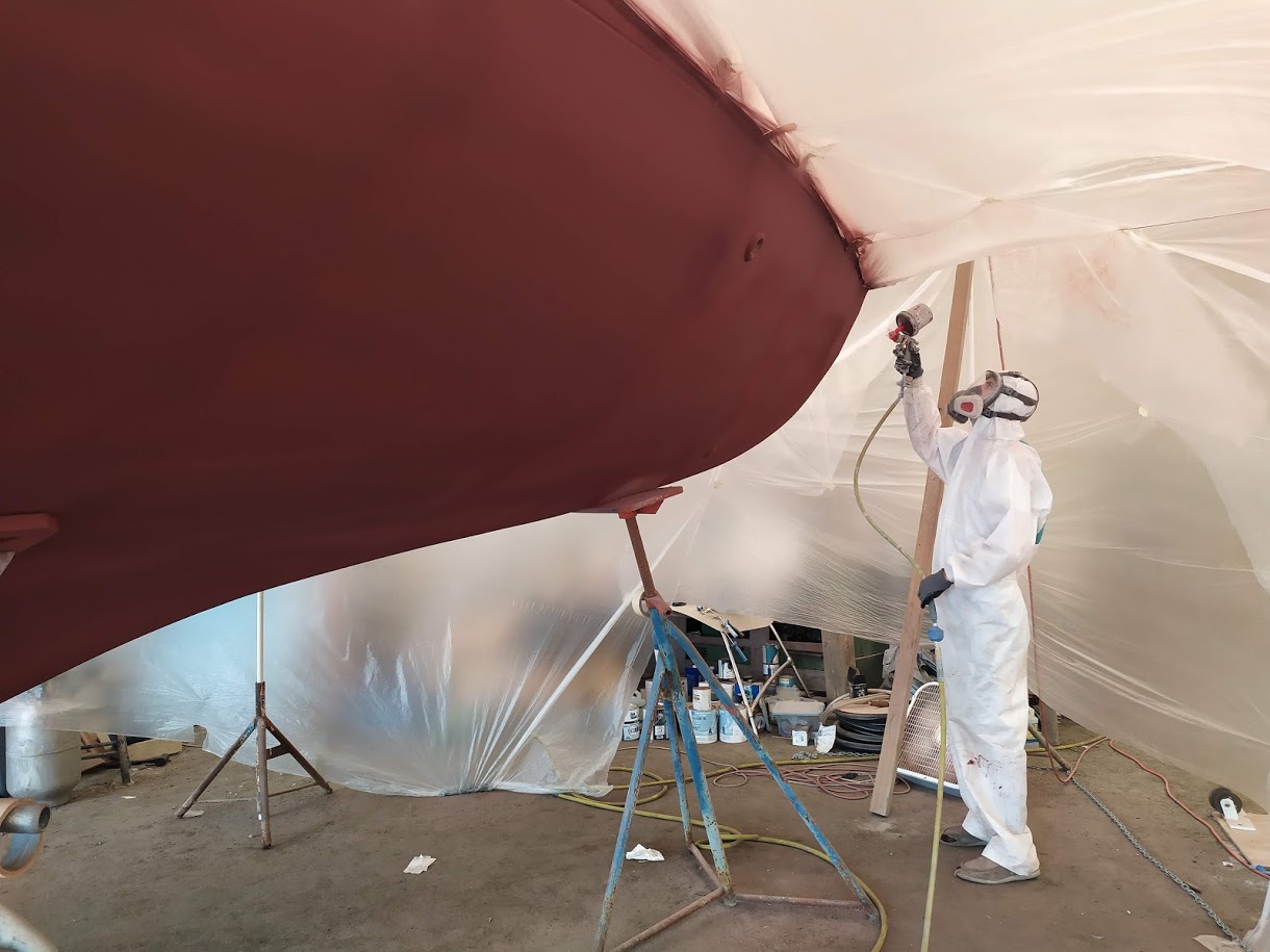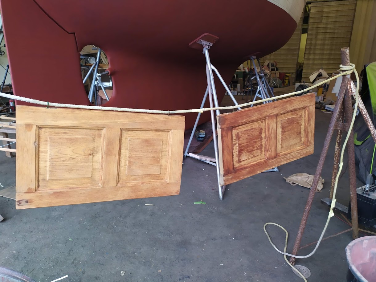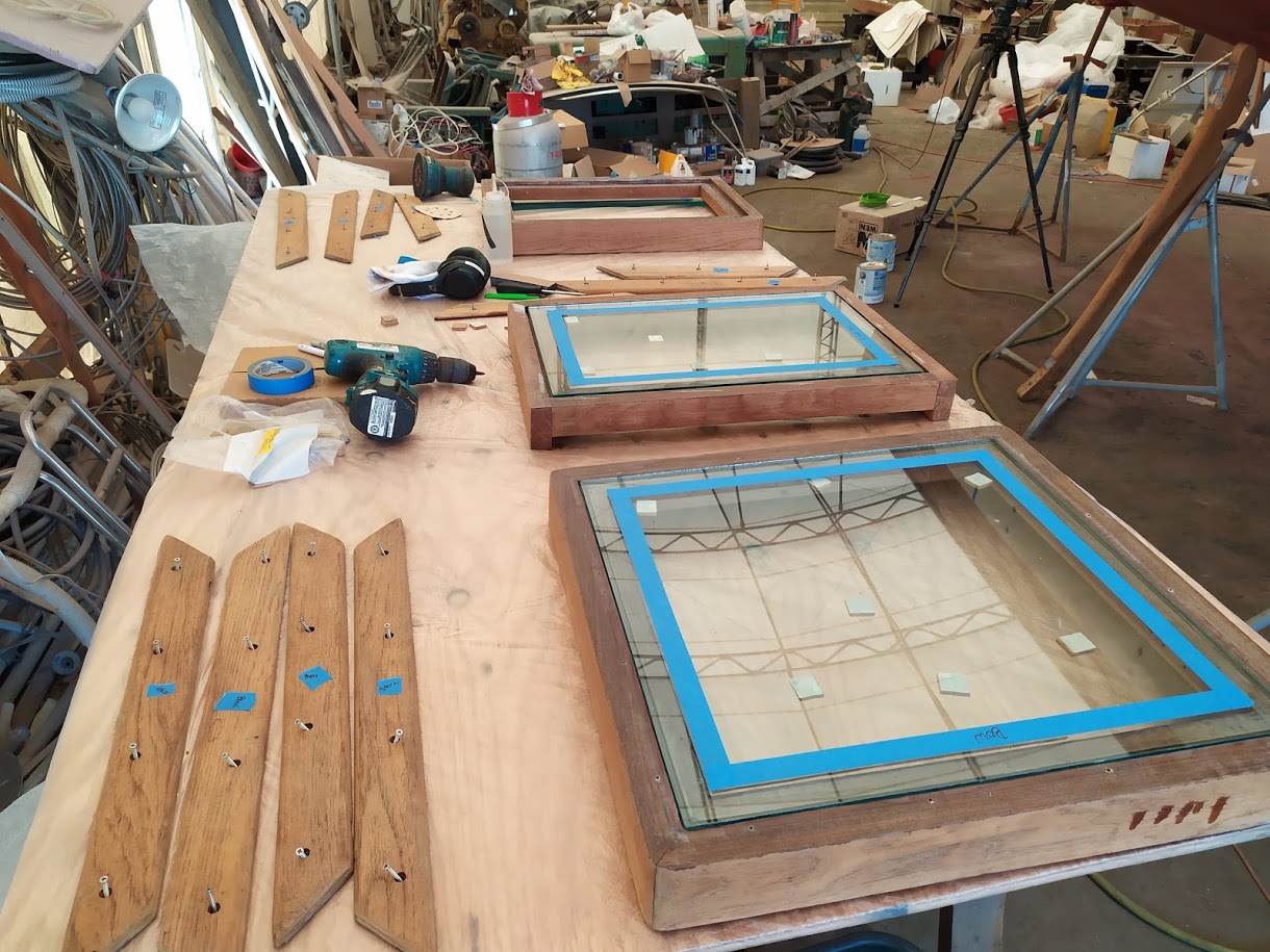 This time around we are spraying the ACE Spar varnish on all the teak that can be removed and brought down to our newly built spray booth. AKA another bubble.