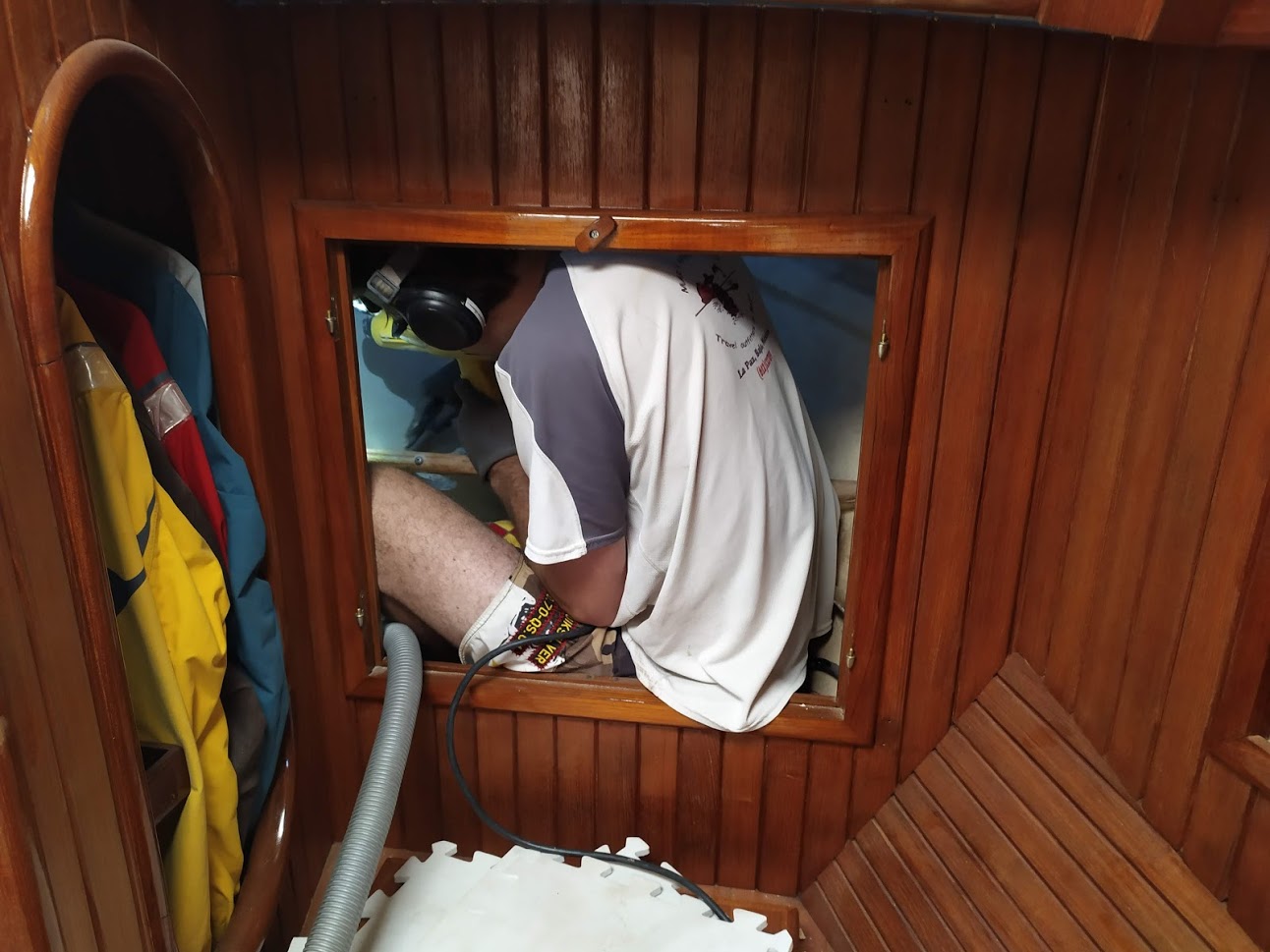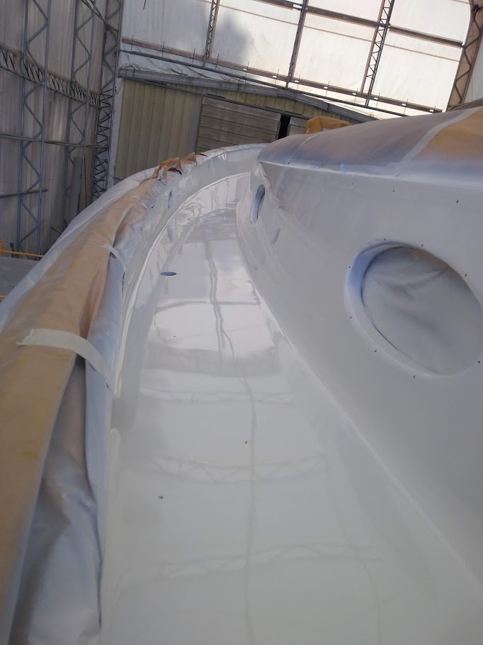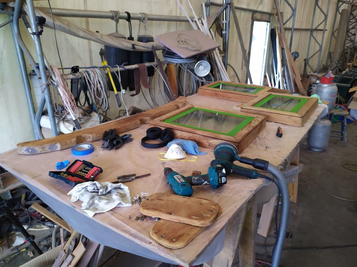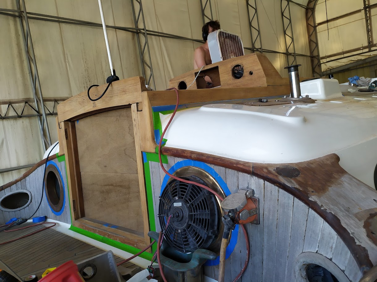 This time around we are spraying the ACE Spar varnish on all the teak that can be removed and brought down to our newly built spray booth. AKA another bubble.