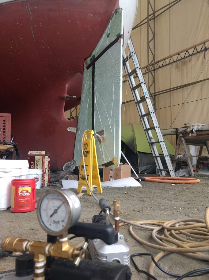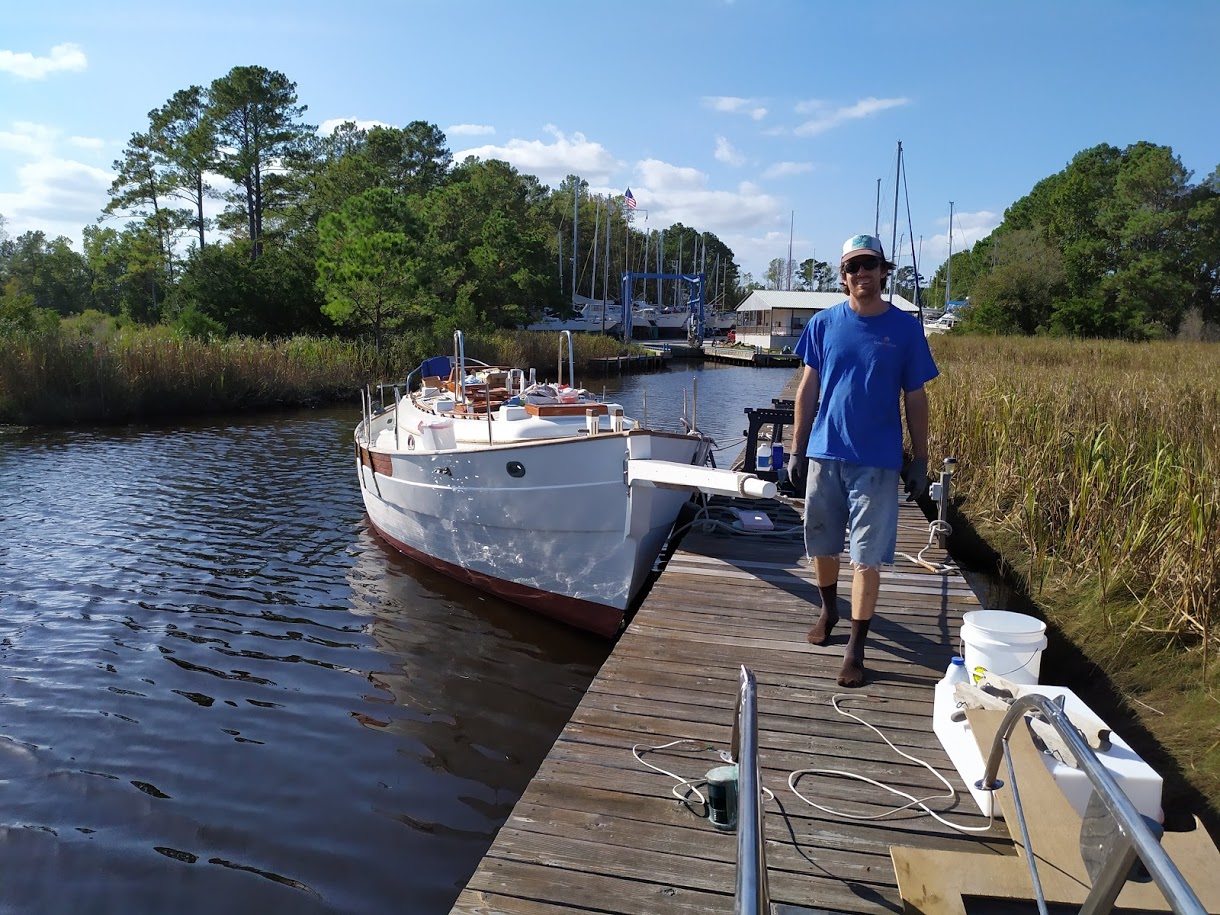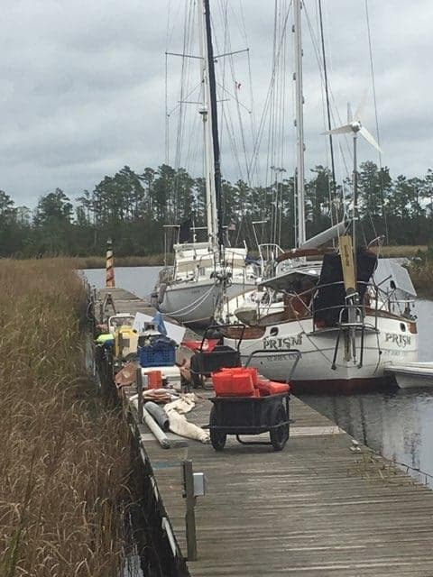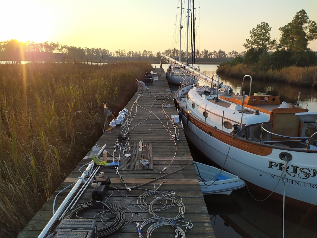 After 3 weeks of being away visiting family in California and a very crazy flight schedule we made it back to Prism. We left Fresno in the morning knowing this airport was the first of 5 we would be in for the day. Fresno to LAX, LAX to Nashville, Nashville to Charlotte, and Charlotte to New Bern. There were times we were running across the entire airport to make our connection, but we made it. We were happy that we had already made the arrangements with our family friends to drop off our car at the airport so we could get ourselves home at the late hour, however our bags didn’t make it.  There was nothing we could do about the bags, as there were no more flights coming in that night. The airport told us that when the bags did get there they would deliver them to us, okay. It was 1 AM when we finally got to hit the hay for our first real nights sleep aboard Prism in a long time. Jon and I were asleep within seconds knowing that there was no time to waste as we needed to get right back into refit mode in a few hours.
