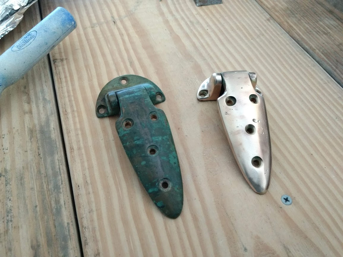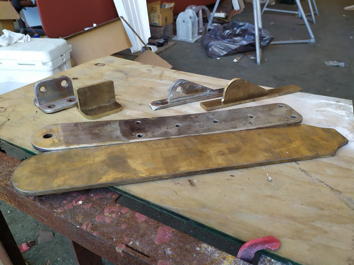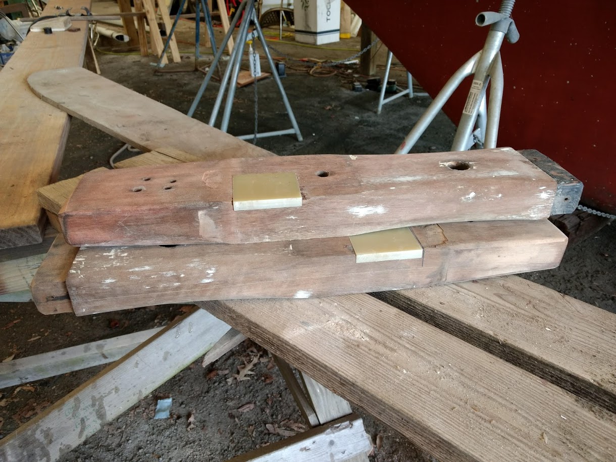 We were given one of the bronze anchor strike plates and any of the teak we wanted as long as we removed it ourselves. Jon went over with a skill saw and a drill to remove what we were allowed to take. The rails were 2×4″ of solid teak and the bronze was 1/8″ thick.  We used the bronze to make our own strike plate, and made a chain guard on our caprail. The teak we used in many different places including to fill in the bulkhead near the engine panel and to fix the captains seat. The left over teak was cut and planed down to make 3″X 2″ X 3′  pieces and are now stored on board for possible future projects.