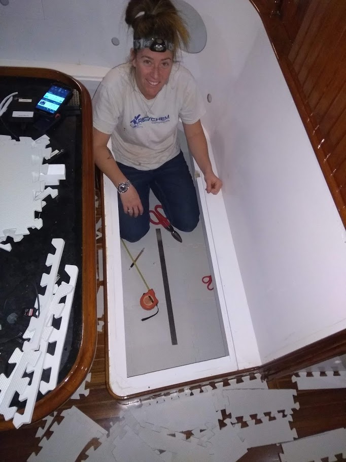 We also took the time before moving all the stuff back on board to line all the cabinets with foam. We did not glue the foam  to the floors we just cut them to size so they fit nice and tight. We wanted to line our cabinets with foam not only to help the paint last longer, but also to stop any potential rattling of tools and stuff.