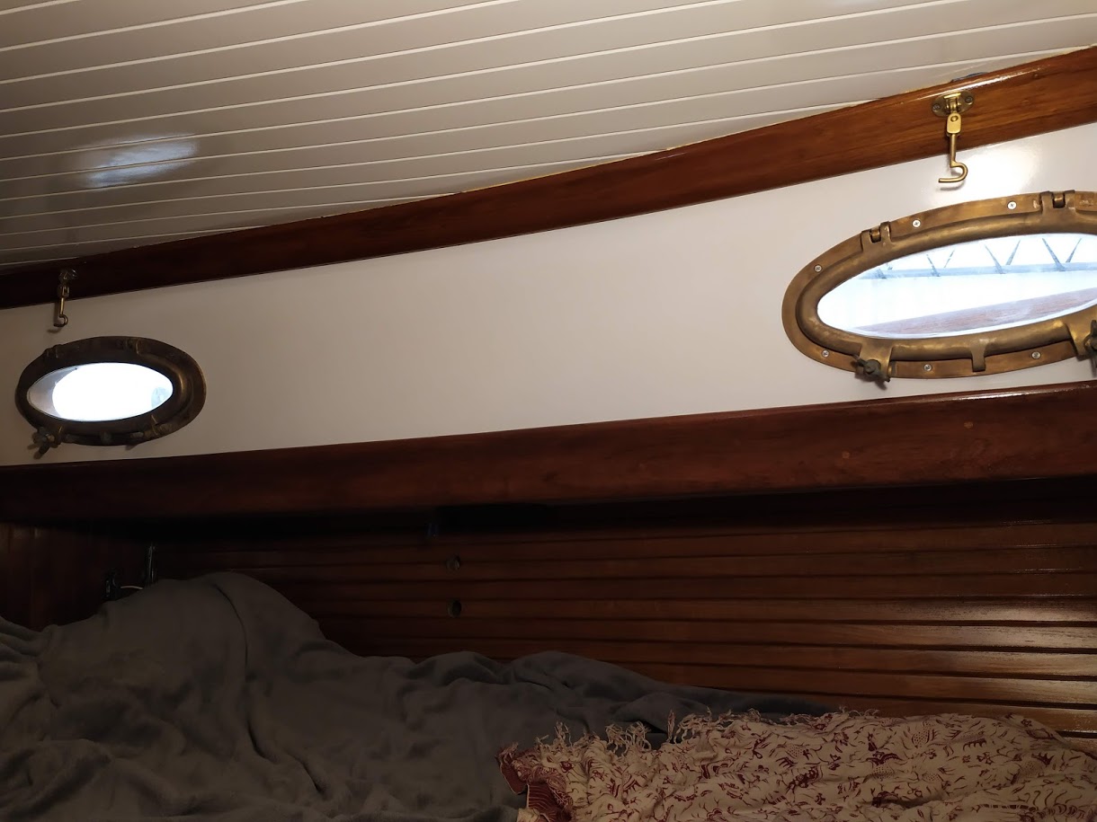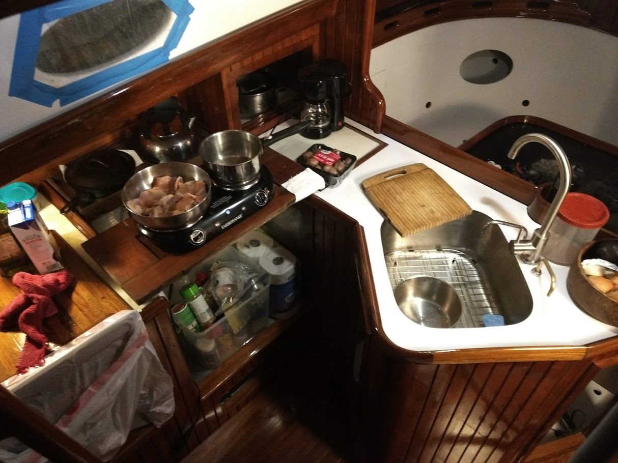At this point in time Jon and I gave up on having a set date of when we will be ready to go back into the water, but we would like for it to happen before hurricane season starts. That gives us 5 months! We got this, right?The varnish is not 100% complete as it still needs just a few more coats, so once again we needed a place to stay while the heavy VOC spar varnish does its thing. The housing gods are somehow still in our favor. Our friend Robert with the Panda 38′ was leaving for a few days and would let us crash on his boat while we finished up the interior.