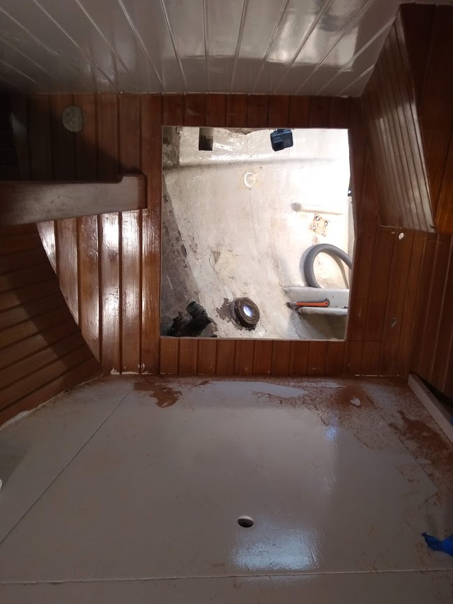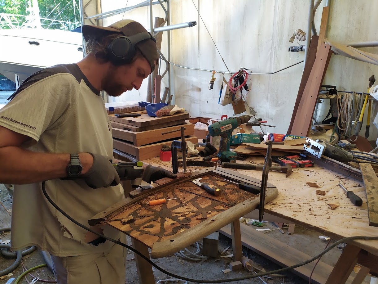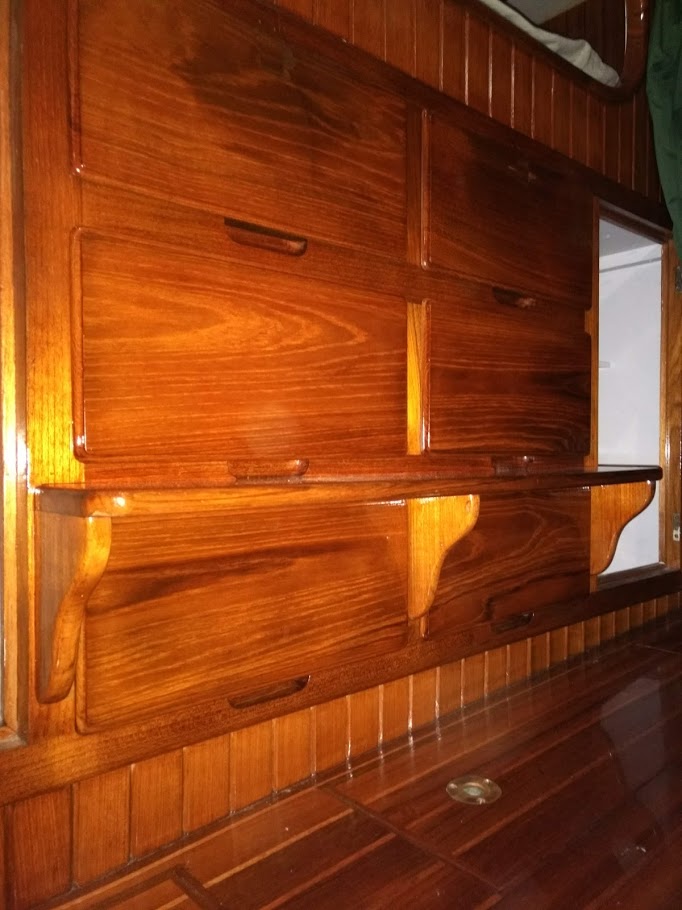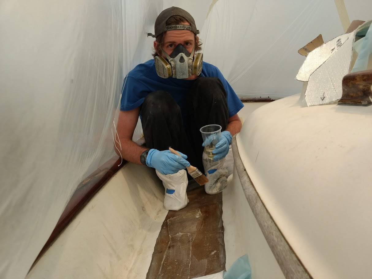 Back at it, after a short crew meeting we decided that I would jump right back into the varnish and Jon would switch his attention to the decks.  So for the next few days, I would prep and apply new coats of varnish while Jon ground into the decks above me. Lets just say that the noise was horrible inside when Jon was working right above my head with a router and grinder.