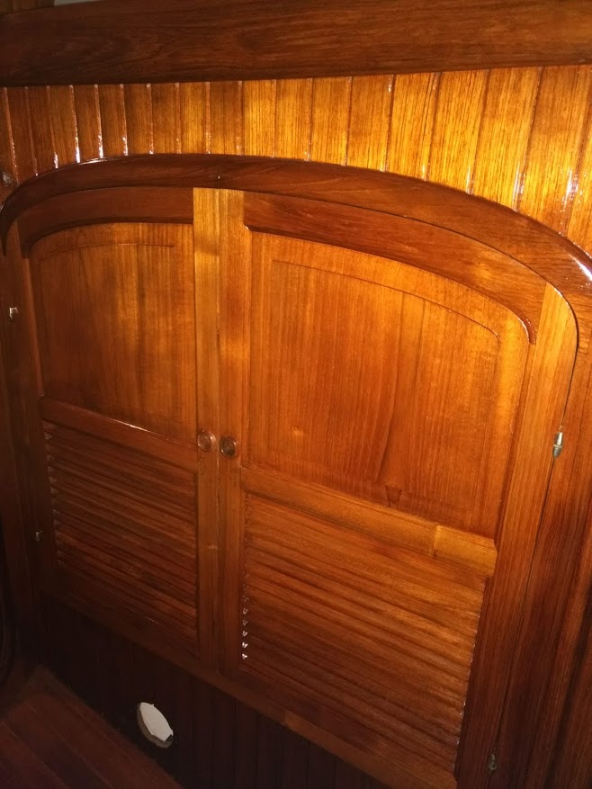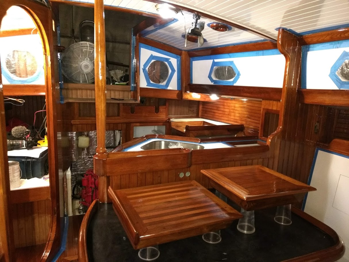 At this point we still have not touched the varnish in the aft cabin and only have one coat on in the head, but we figured we needed to focus on the areas needed in order to move back aboard. When on the hard the head is not used and  the aft cabin is acting as a storage space. Once the main living space had 7 coats, we called it good and started to move back aboard.