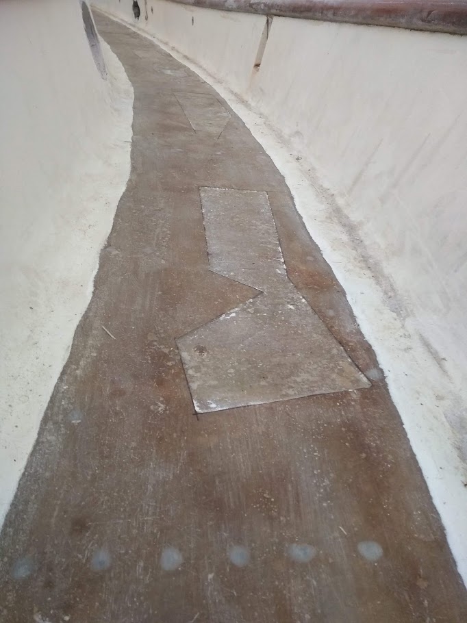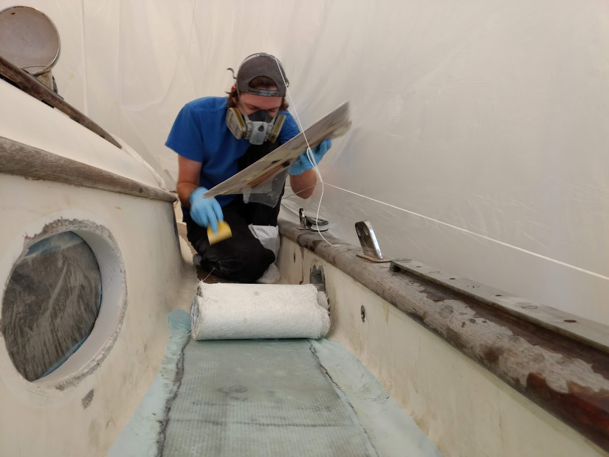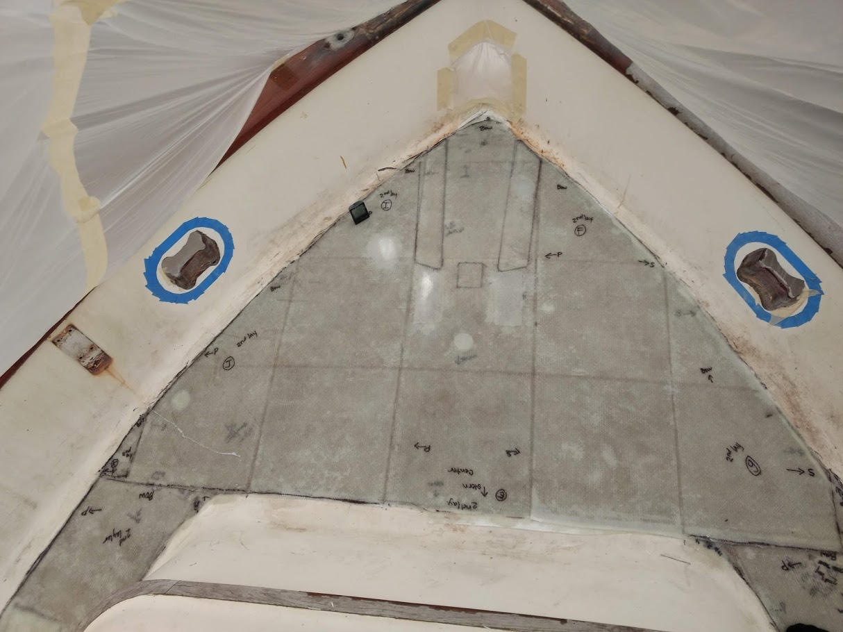 We would trace out the shapes of the deep sections with pencil and paper then transfer them to the 1708. Some sections required 3 to 5 layers of material to bring that section back to the level of the rest of the decks. After we cleaned the areas and wiped down with acetone we applied a thin later of thickened epoxy to fill any tiny imperfections and really create a level surface for the first layer of saturated 1708, then the second, and third and so on. Once all the small(ish) repairs were filled and level it was time to lay down the 2 new layers of glass along the entire decks.