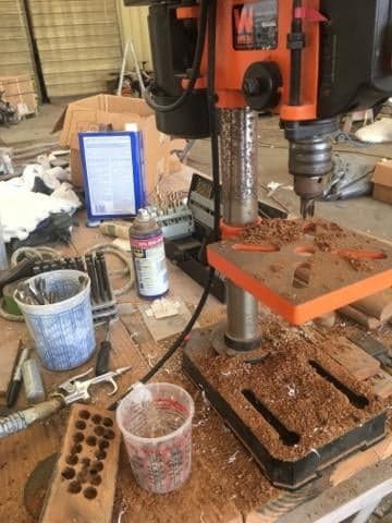 While Jon and I were packing every square inch of Prism, Debbie was up in the tent making hundred of teak bugs for us. We had the drill press, lots of teak that could not be used for anything else and the bung tool, so why not. Thanks mom!