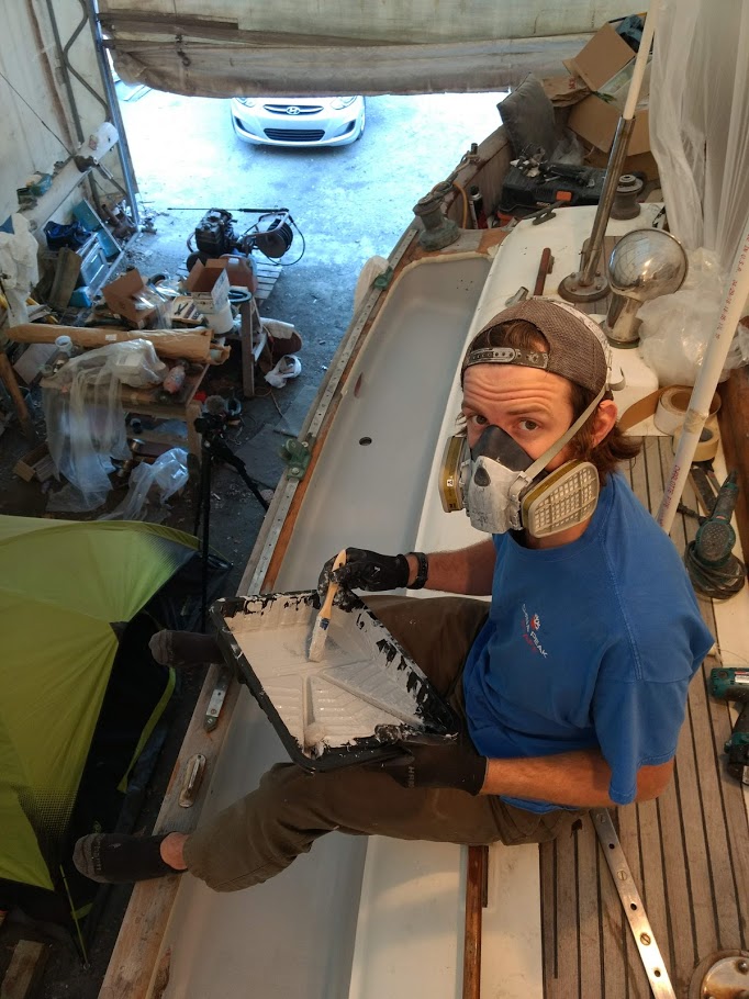 Once we were happy with how everything fit and had everything filled and fared to make the surfaces smooth and beautiful, we set up to roll on the Tuff Stuff barrier coat on our decks. By doing the decks and cabin top in 2 steps we were able to sit on the cabin top with our feet on the cap rail to paint the decks, bulwarks and cabin top up to the eyebrow with out any hiccups. Because the forepeak is too large for that kind of reach, we placed a piece of wood across from the head hatch to the cap rail to gain access to this area. Working together and into the wee hours of the night we rolled on 2 coats of barrier coat sealing off our decks from any water in the future.