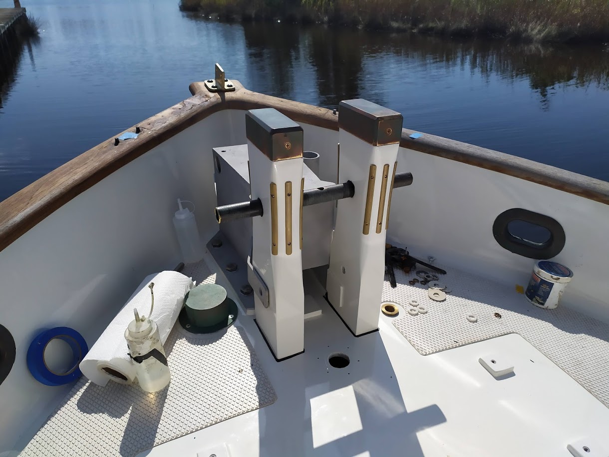 We also needed to come up with spacer plates for our windless bracket. Now that the teak was no longer there, we needed to make up the difference in height so our bracket and windless would fit. Our solution was to use G10. Jon had cut out pieces of the extremely hard and durable material to match the foot prints of our windless, and the dive compressor box as well.