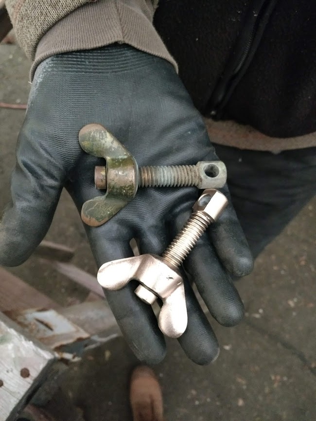We were able to remove all the other hardware with almost no problems. However, our teak handrails were looking like they were almost beyond repair. Jon and I started to talk about other options, like brass rails with teak holders but nothing wood look as good at the old fashion teak rails. After a few hours of talking we came up with a plan to bring the rails back to life. The staysail winch cleats needed to be addressed as the STBD side did not even have nuts to hold the bolts in place. This we found out once we cut into the newly painted headliner to find 2 bolts bent in a “J” shape so they could not be pulled out.