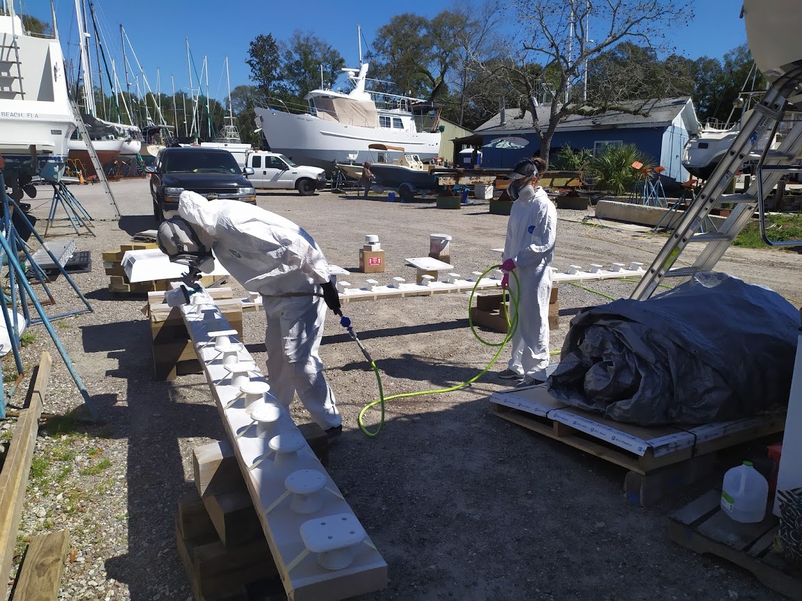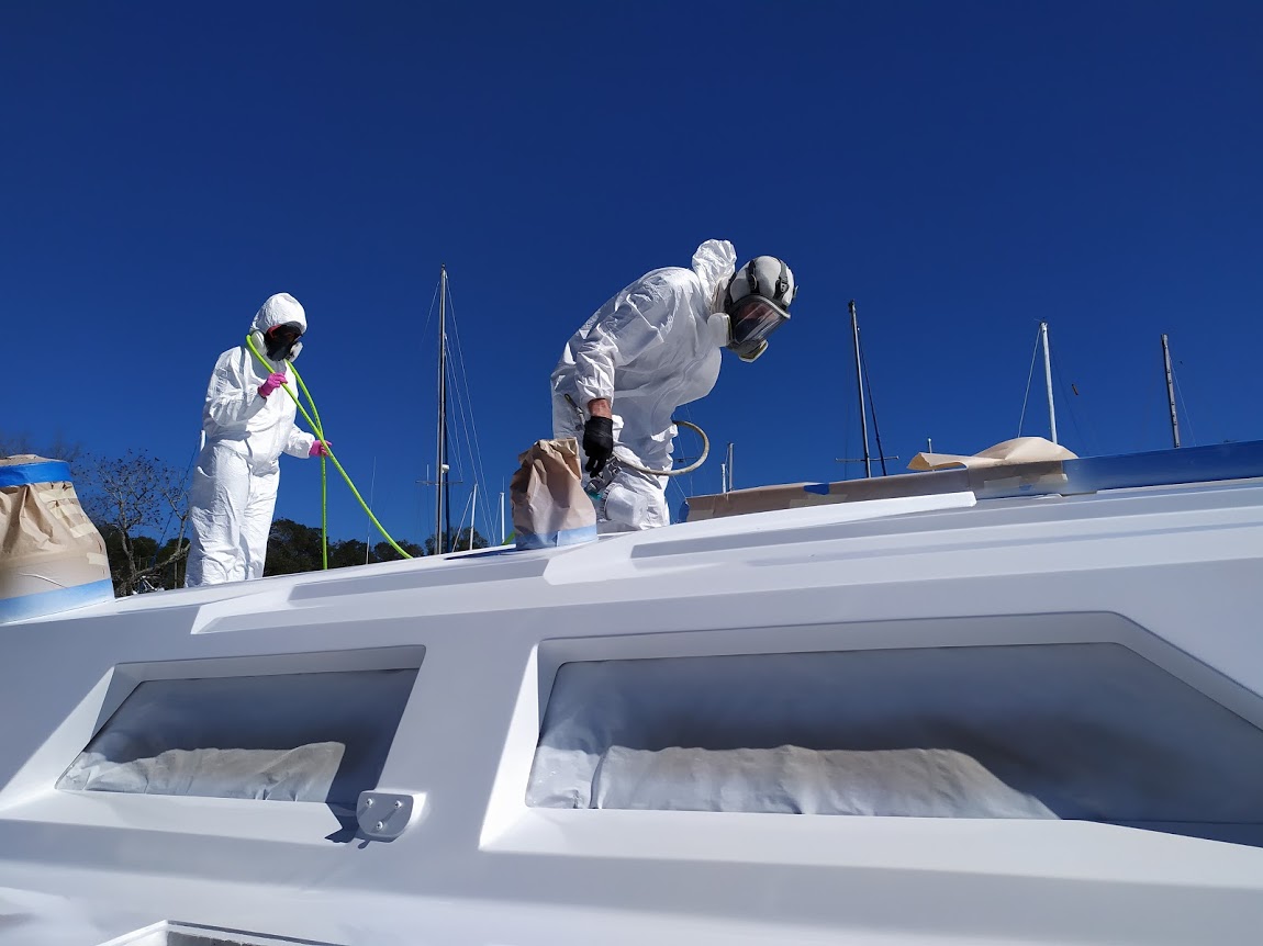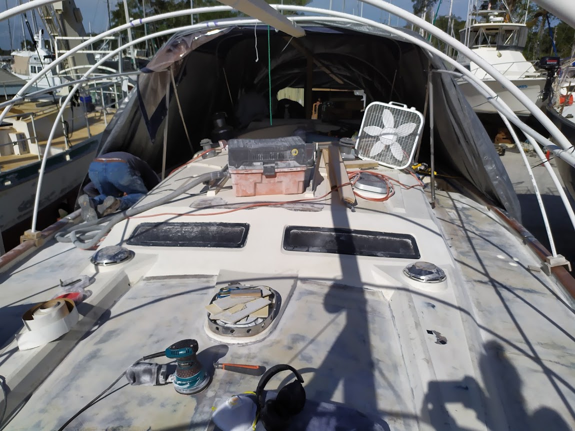 It took a few days to wait for the weather to be perfect enough to paint the high build primer. The following day when the high build was dry, we all partook in another round of filling, fairing, and glorious sanding. When we all agreeded that the entire surface was 100% smooth, we were ready for the Alexseal primer. The weather chose that week to show up, causing us to wait a few days till it was dry enough to spray. When primer day arrived, all four of us were ready to get the job done! The topcoat primer went on without a hiccup. We were all stoked, knowing that we would only have to sand that cabin top one last time. The weather once again chose to show its face, causing delays on our sanding days. It took about 3 more days to get the cabin top and decks sanded and prepped for the final topcoat. Finally, the day had come; the weather was perfect, the bugs were less active, and we were all ready to get the paint on! It is quite amazing how long it takes to wipe down a 44′ sailboat. The four of us worked like a well-oiled machine. Jon was the sprayer, Christina was the wet edge guide /hose handler, while Derek and I were on the ground mixing the paint. Because of our late start, we pushed a little later into dusk than we wanted to, causing us to get the last coat on pretty late in the day. We all hoped that the paint would dry before the dew point hit.