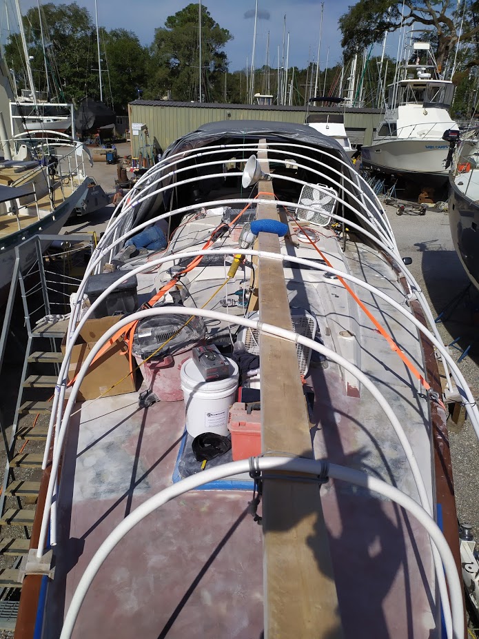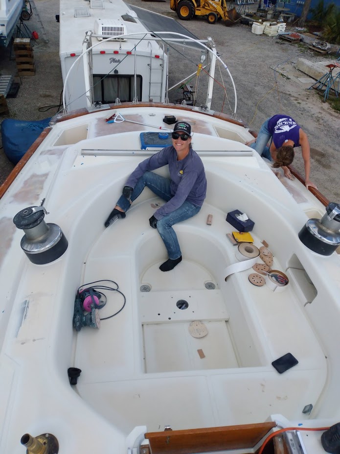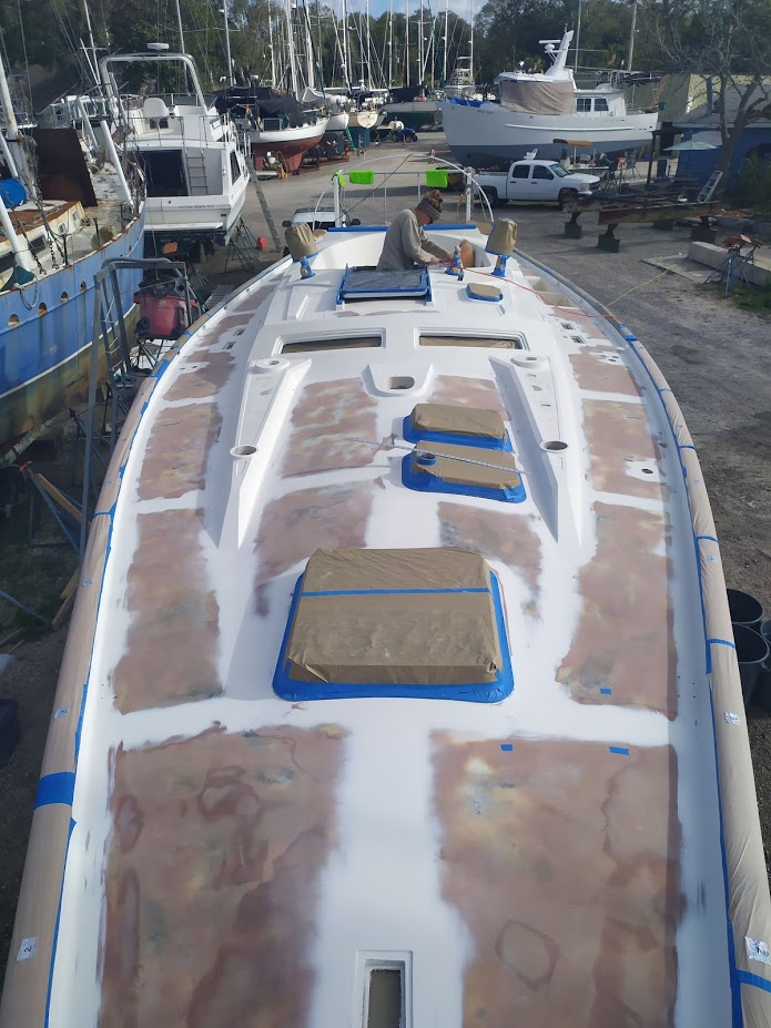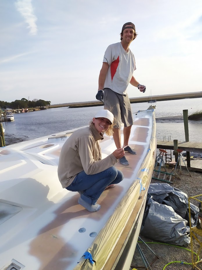 Luckily a few days later, the weather cleared up, and we were set to go once again. This time, it was a do or die paint job, Jon and I were out of time and needed to start heading back north, and Christina was also heading back home. We had to nail this paint job. Taking our same positions and starting earlier in the morning, we were able to get 2 coats of Alexseal Matterhorn White on the decks and were done by 2pm. SUCCESS!!!