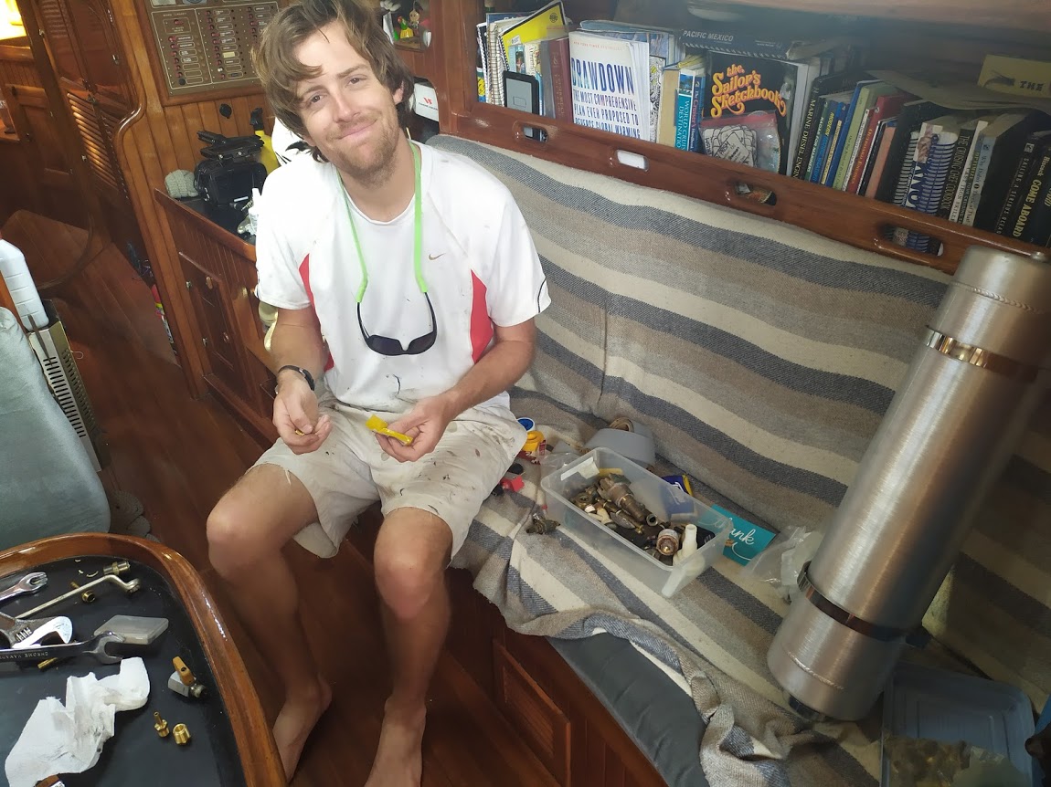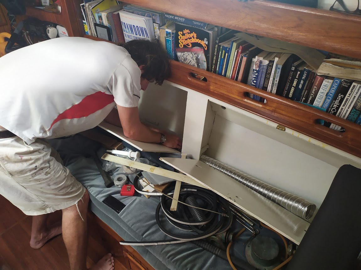 A few days later, we had our new forced air diesel heater. Previously in Prism’s past, she was set up with either AC or heat, so she already had the holes for ducting and vents throughout the cabins. All we needed to do was buy the ducting, the heater, and all that goes with it, then install the system. We did have to drill a new hole into the back of our boat for the skin fitting (exhaust), which Jon did while sitting in Falkor at anchor. Having heat on demand has changed our life while out at anchor.