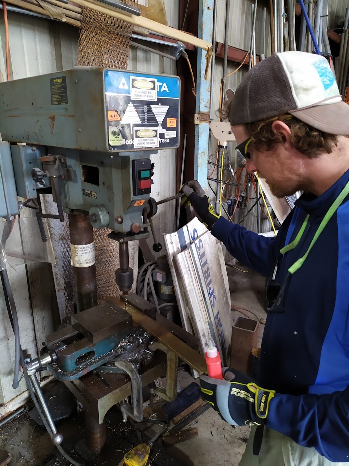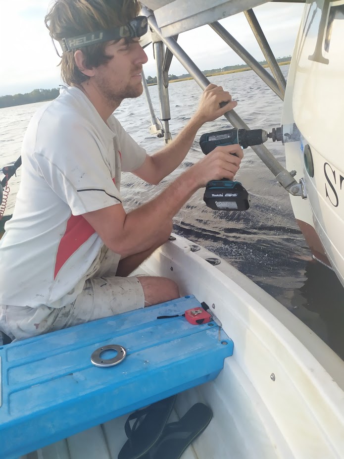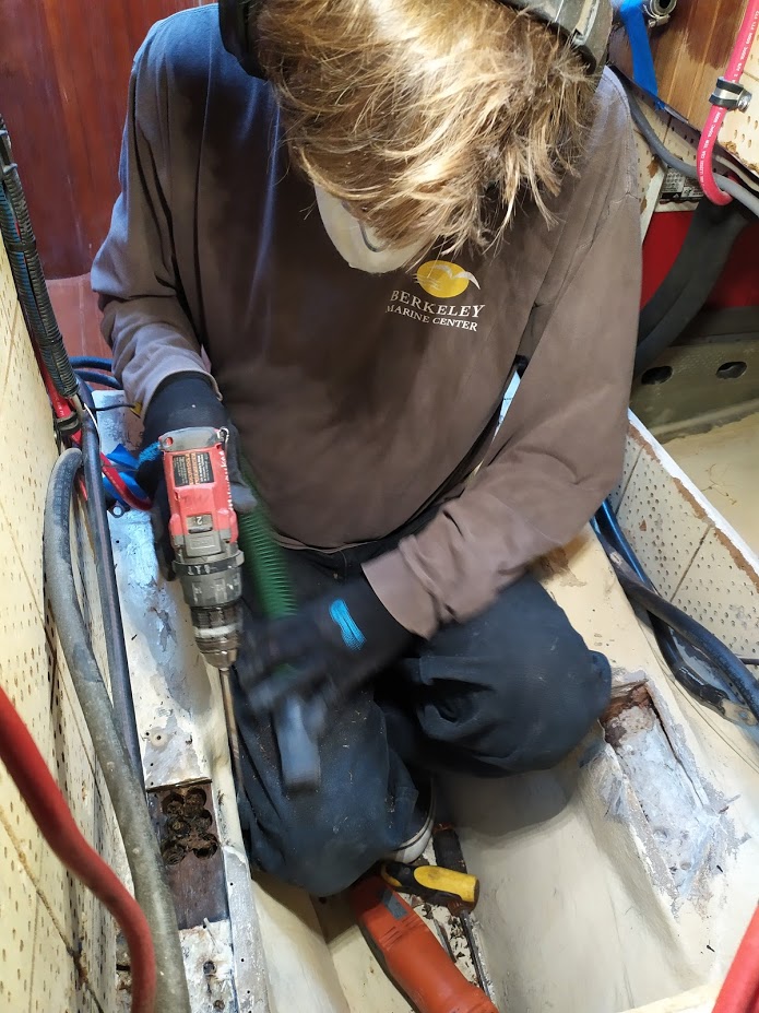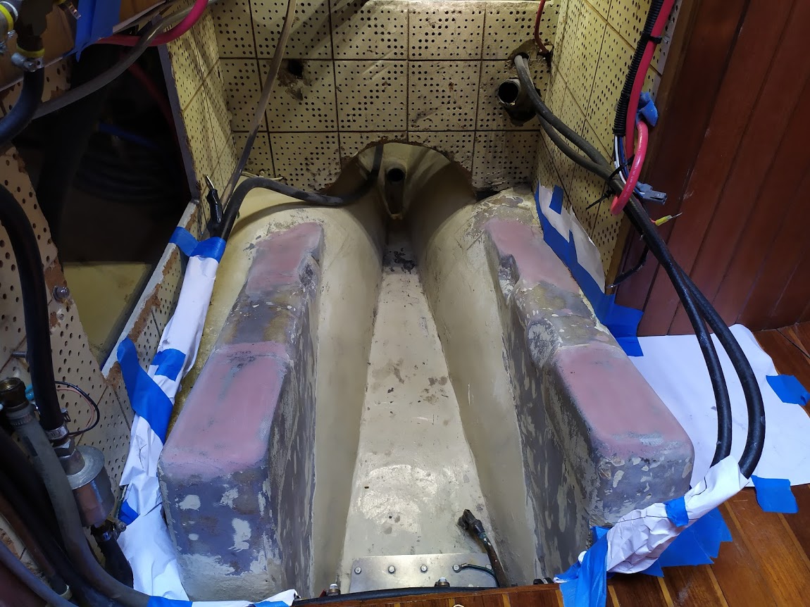 The trip up North River was quick and uneventful. In true Prism fashion, we anchored way out in the boondocks. We found a spot free from crab pots, away from a few abandoned-looking vessels and deep enough to allow for the 6+ foot tide. The next day we headed into the yard to start work on Brandon’s boat, Bella (a sister ship to Prism). First up was getting the engine out and onto the ground. Jon and I then worked on cutting out the steel plates in the engine beds, which we replaced with G10. Once we had everything fitting, we laid up the engine beds’ in epoxy and a few layers of 1708. In the next few days, we also worked on Bella’s stern tube and added some fiberglass reinforcement to the area where the backstay chainplate is bolted through.  Brandon made all the measurements and ordered the metal for the chainplates. Once it arrived, Jon got busy sanding the bronze, drilling the holes and rounding the edges. We did not get to the point of installing the plates as Brandon was in the middle of his paint job. But the new chainplates are ready to be installed when Brandon is ready.