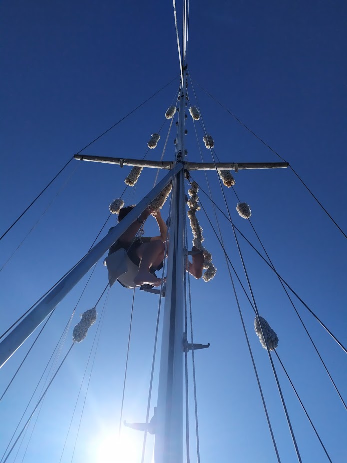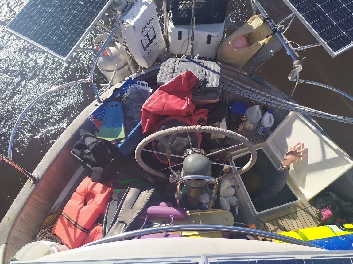 First, Jon took apart our pedestal. He found that the chain had skipped the sprocket and was caught up on one side. He fixed that, then moved onto what was actually jamming the entire quadrant itself. It took a minute for us to clear out our lazarette locker, but we finally saw the problem. The funnels we use for standard maintenance, had gotten thrown from their storage shelf (we think during the surfing entrance) and into the quadrant. The funnels’ wedged themselves between the hull and the quadrant, leaving no room for movement. Wow, that really could have been bad, we were lucky this time and will take more precautions when packing the locker from now on.