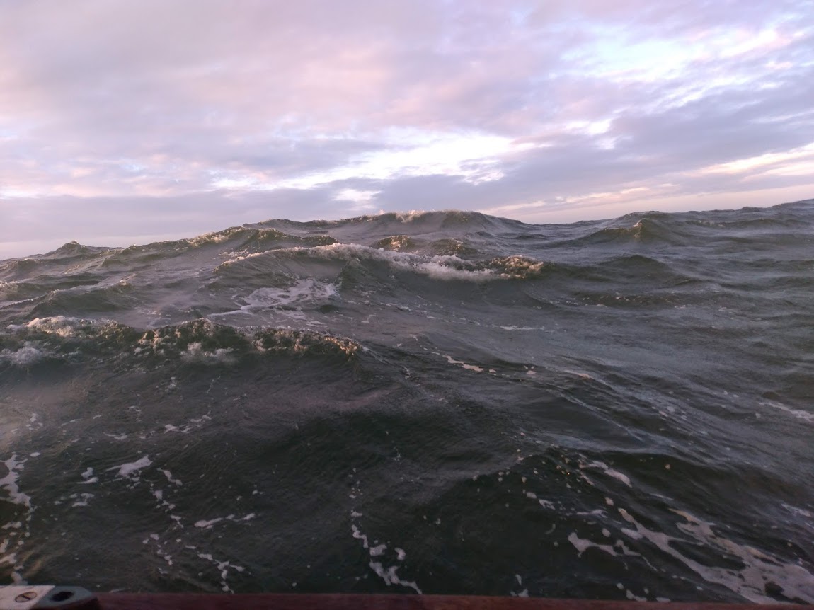 Before we left, we had been watching the weather for a window to allow a somewhat pleasant passage south, but no such windows presented themselves. We chose this one knowing that if we went too slow, then the strong north winds were going to catch up with us and make life less enjoyable. The wind kept up enough that we sailed with the jib alone throughout the day, keeping the building seas on our aft quarter.