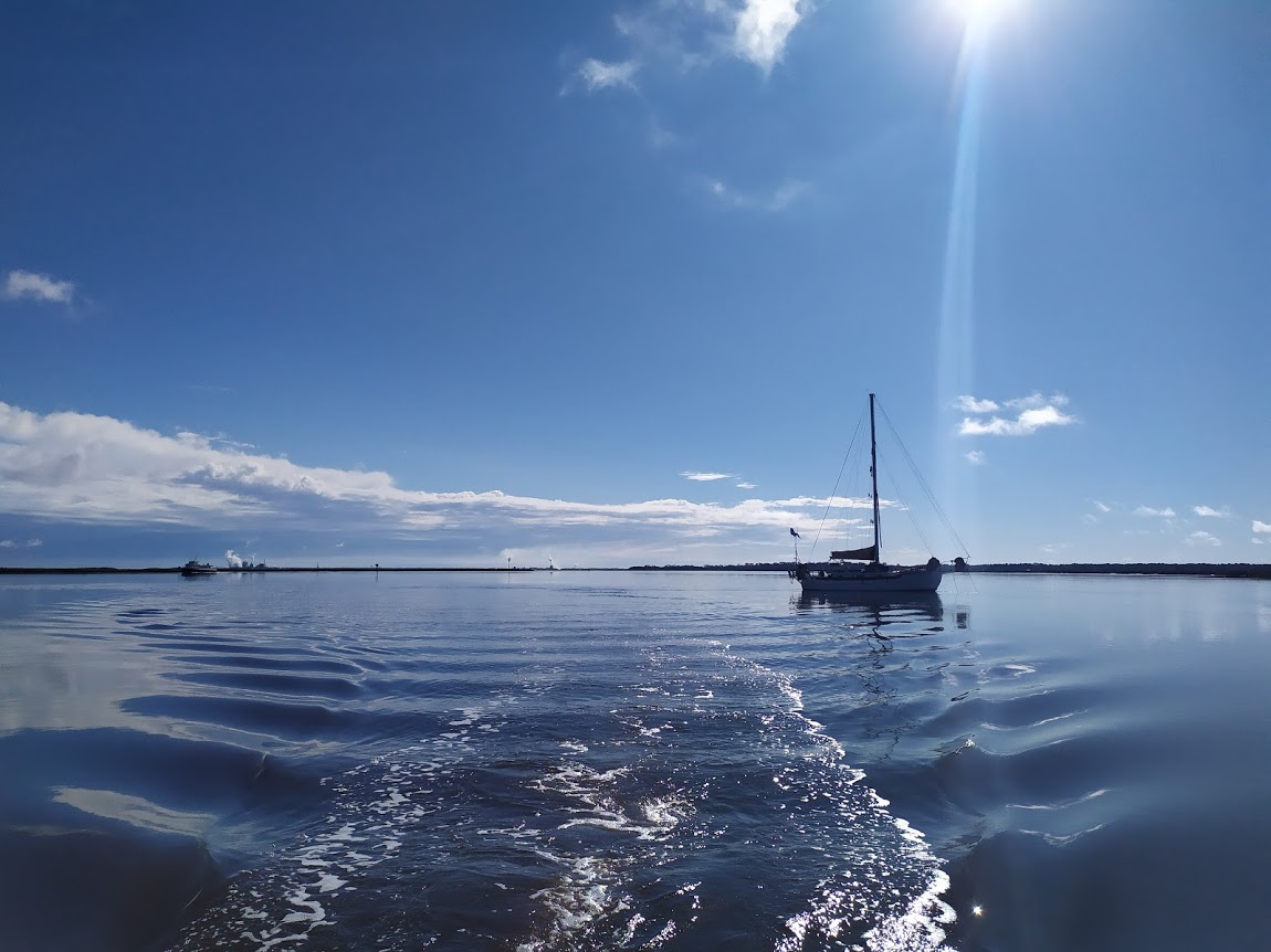 We were up before first light to make it to the Charleston breakwater by dawn along with the slack tide. I was on coffee duty while Jon tacked back and forth while waiting for the commercial ship traffic to clear the inlet. I guess you could say it was nice that we had a stiff wind to help sail us out into open water, however, while we were waiting for the traffic to clear the channel, the tide went from slack to ebb. The outgoing tide was now meeting the stiff breeze causing some nasty square chop. Good thing we took our dodger down, not! We had to close up the companionway fast, while I stayed down below to secure what I thought was a passage ready boat. Jon was drenched wave after wave as he beat our way out of the channel till we could turn south and get away from the breaking seas caused by the jetty. That was one hell of a way to start a morning, Jon was dripping head to toe, but we had plenty of wind to push us along with just the jib. Once Jon was changed and dry, we set Prism up for the sail south.