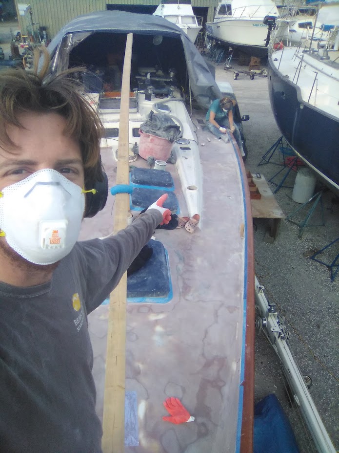 Derek and Christina had been working on their boat for a few months at this point. They removed the teak decks and did some core replacement during the summer months. Now they were at the point where they needed to fair the toe rail into the new lower level deck. We helped fair the side deck, ground out Gelcoat cracks, shaped the drains, created flush holes for their prisms, and created a radius that connected their toe rail to the side deck. While working on Fin, we would all be covered head to toe in Skin So Soft to help repel the biting Midges. Those little flying f*ckers were hands down the worst part of GA. There was no getting around them, the only time they were not making our lives miserable was when it was raining, or when it was blowing hard enough to keep them down. Also known as No-See-Ums, the Midges bite is immensely itchy and last for weeks! To put it simply and literally, they suck.