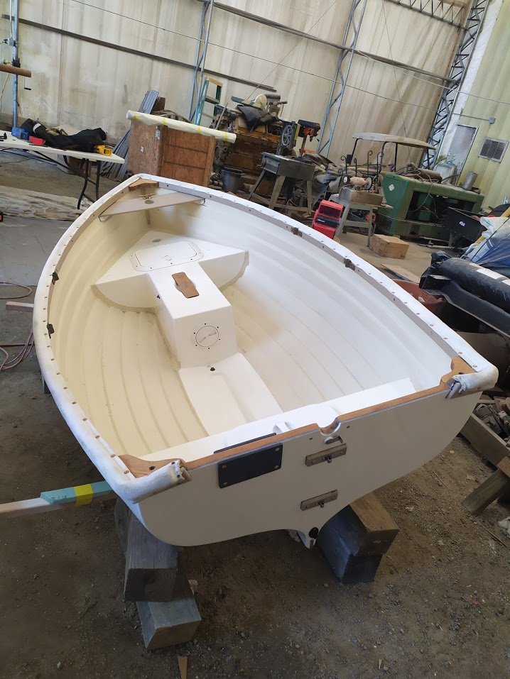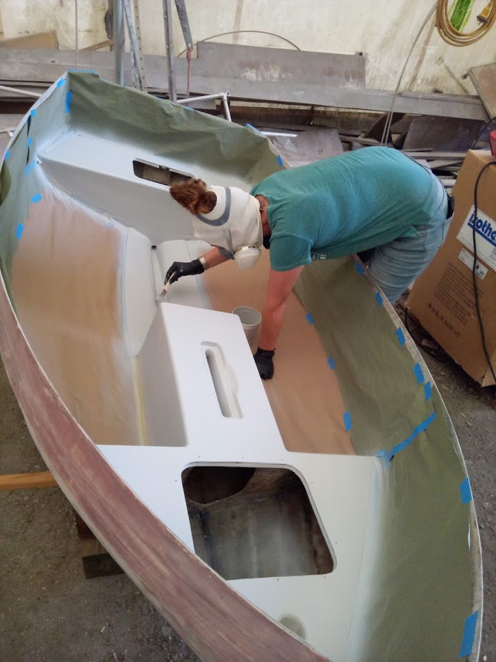 The cream paint on the inside of the dinghy was in good shape, so we left that alone. The outside hull got the full treatment of an epoxy barrier coat, a topcoat of Awlgrip Oyster White, and the same goes for the seats and the center line on the inside.