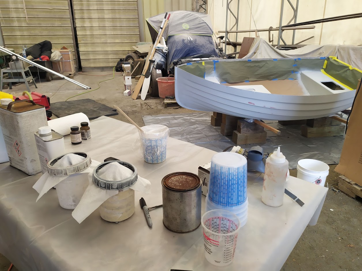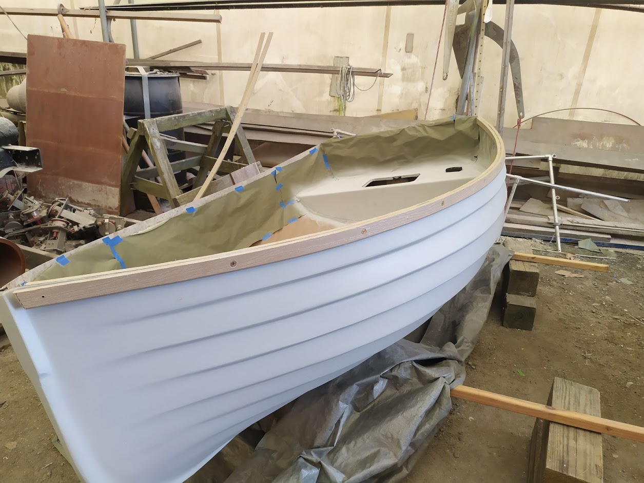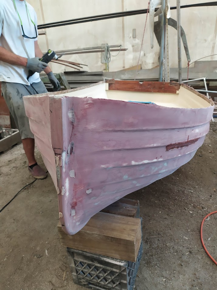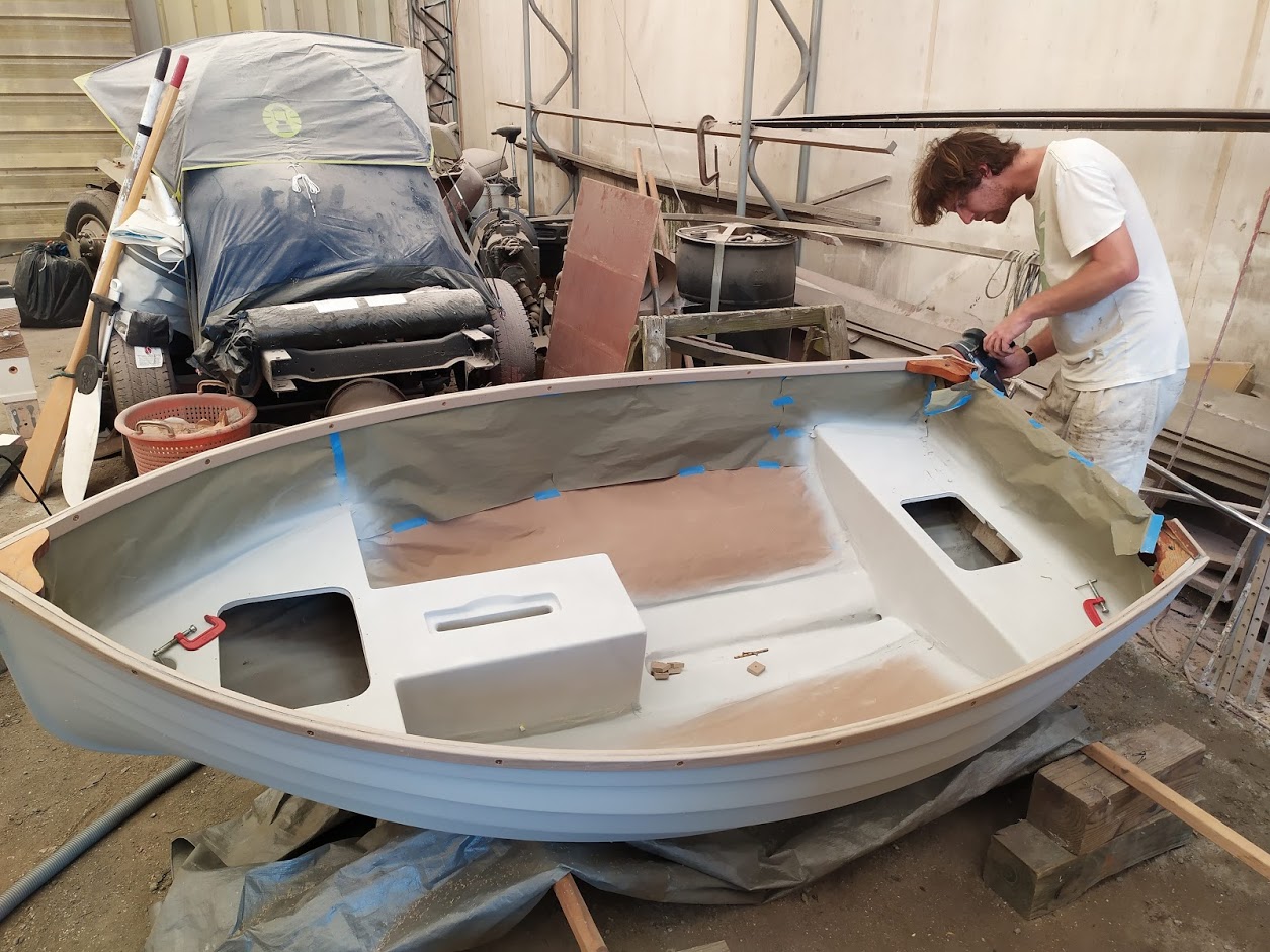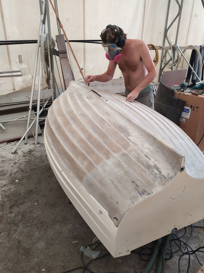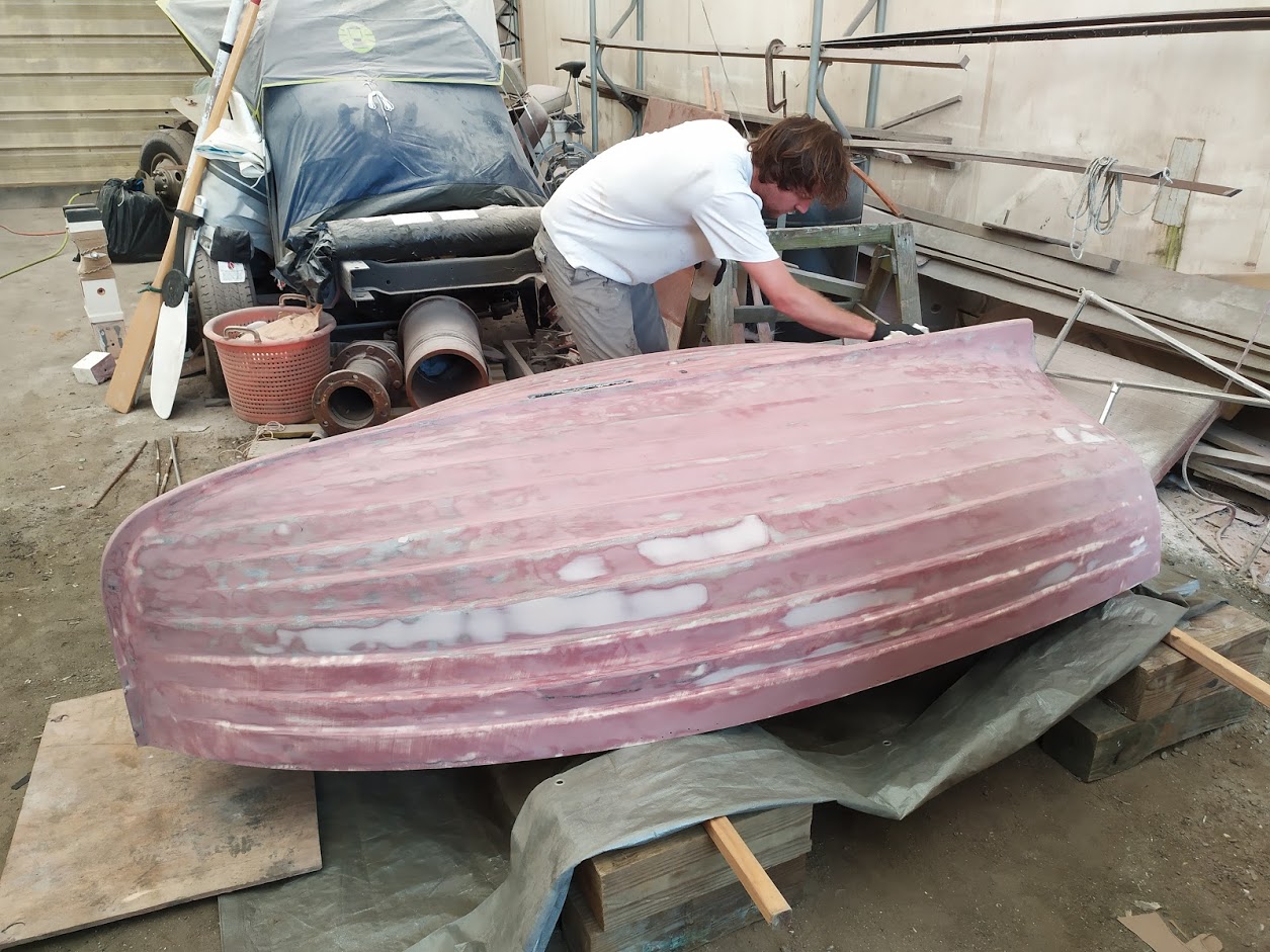 Once all the inside repairs were done, Jon and I flipped her over. We then laid up two layers of 6oz biaxial where the peel had been performed, then one layer of 17oz over the entire hull followed by lots of fairing compound. It definitely took some finesse to get the material to contour to the lapstrake hull, however, with enough thickened epoxy, we made it work. Once the epoxy had cured, I spent the next few days filling, fairing, and long-boarding my heart out. Who knew an 8-foot dinghy could be so big? I felt like it was never going to end. It eventually was as smooth as a babies bottom and ready for paint.