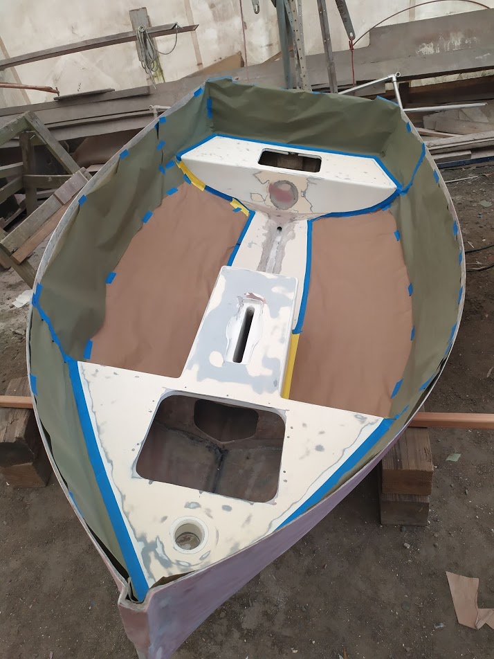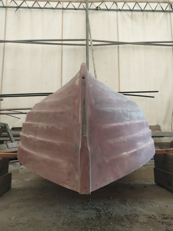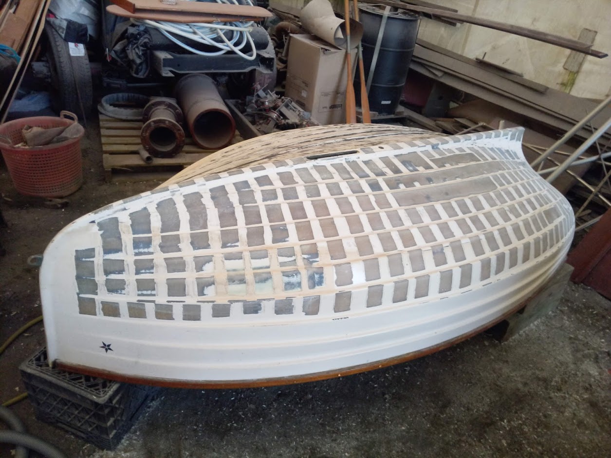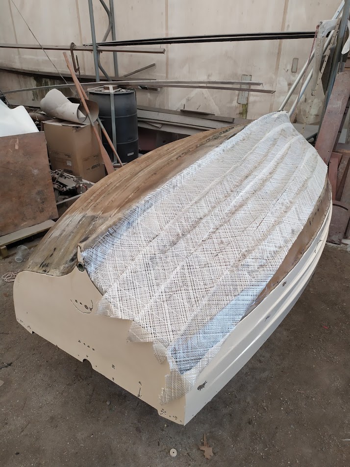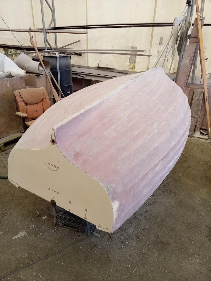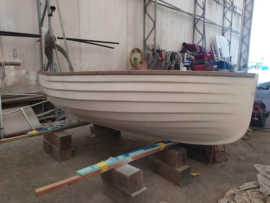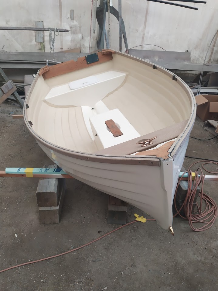 Once all the inside repairs were done, Jon and I flipped her over. We then laid up two layers of 6oz biaxial where the peel had been performed, then one layer of 17oz over the entire hull followed by lots of fairing compound. It definitely took some finesse to get the material to contour to the lapstrake hull, however, with enough thickened epoxy, we made it work. Once the epoxy had cured, I spent the next few days filling, fairing, and long-boarding my heart out. Who knew an 8-foot dinghy could be so big? I felt like it was never going to end. It eventually was as smooth as a babies bottom and ready for paint.