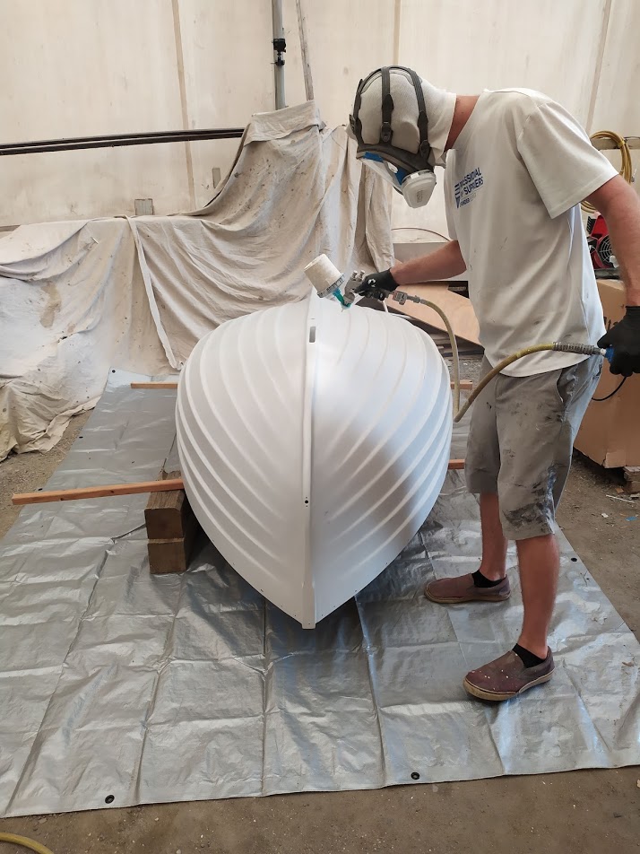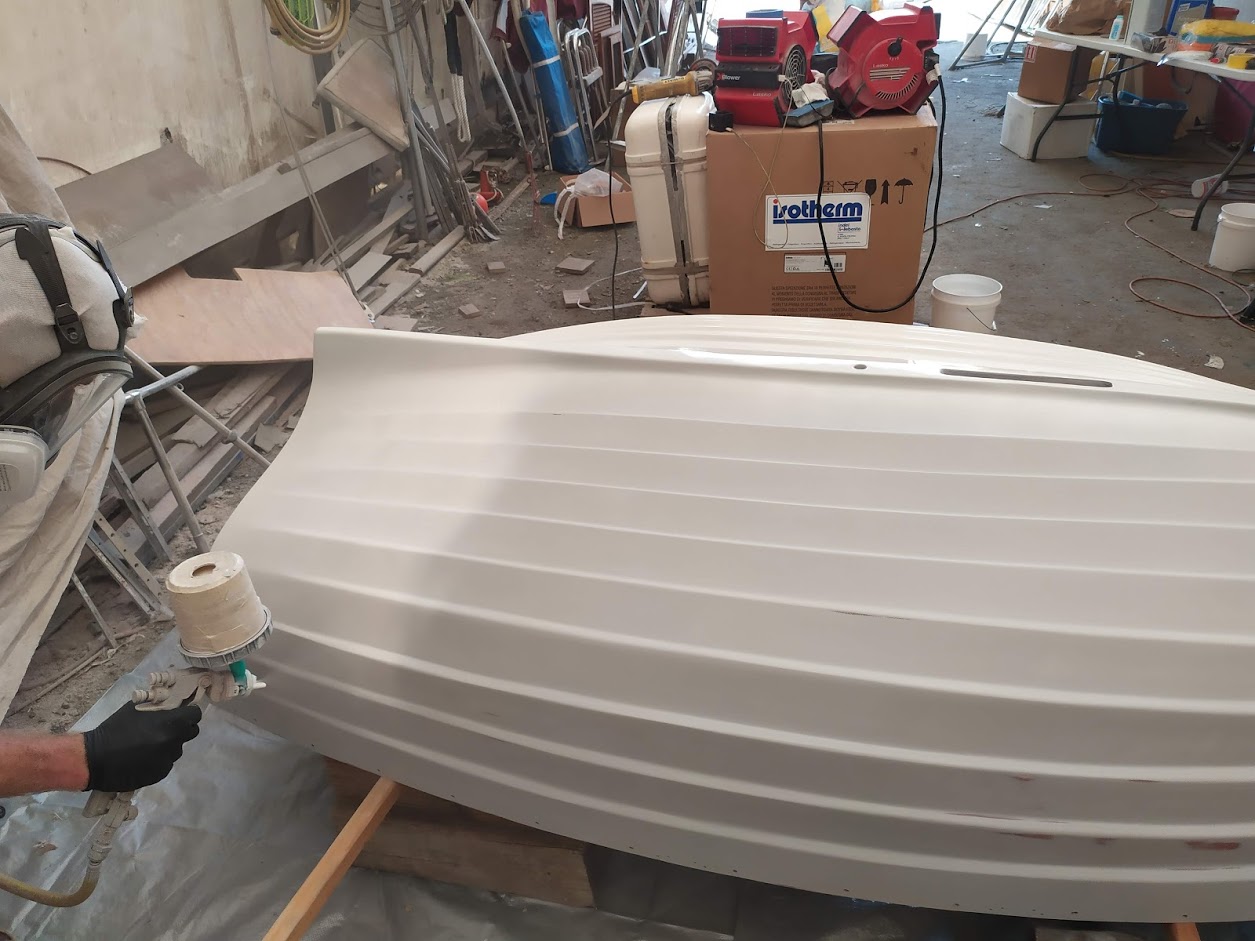 The STBD side went without a hitch, but for some reason, the Port bow threw in a wild card. CONTAMINATION! During the final wipe down we must have missed a section that had oil or something on it. AHHH! Well, it is just a working dinghy. So, we quickly wiped it down with the reducer, cleaned up the edges as much as we could then continued to spray the Awlgrip. To our surprise, the boo-boo on the port bow somehow did not end up sticking out like a sore thumb.