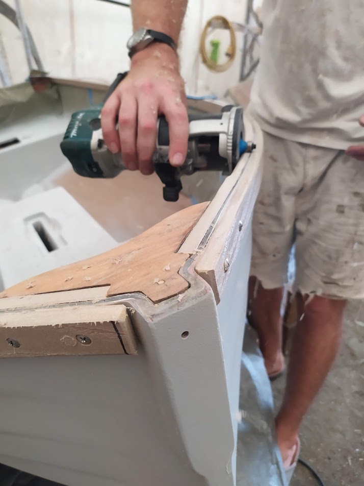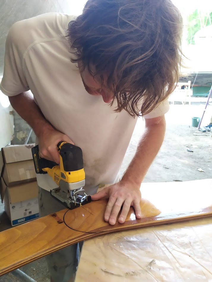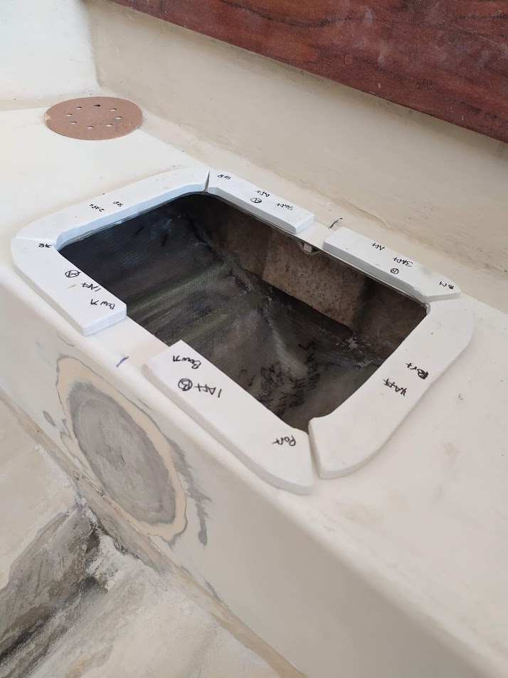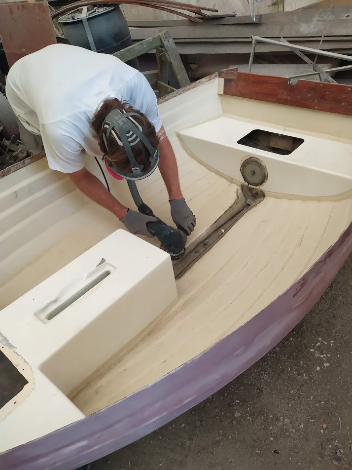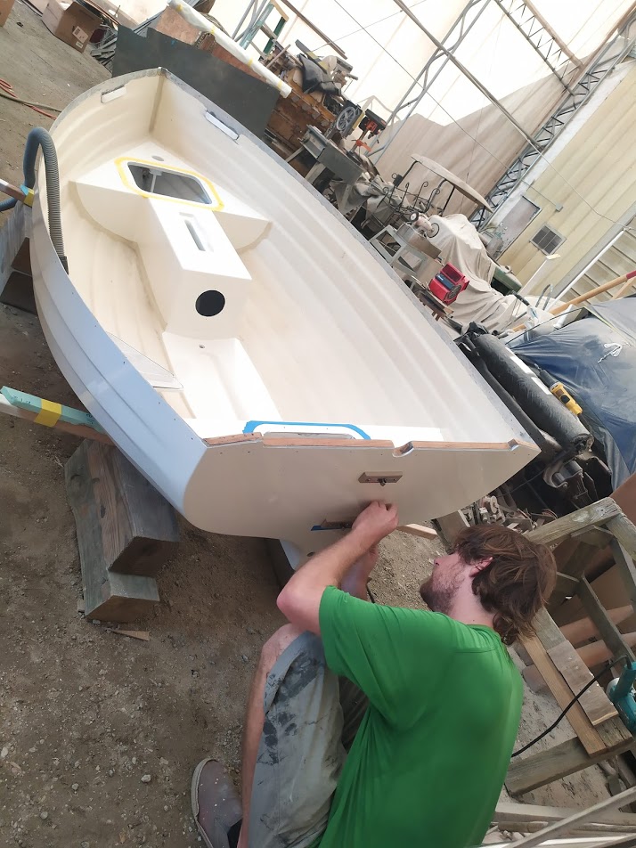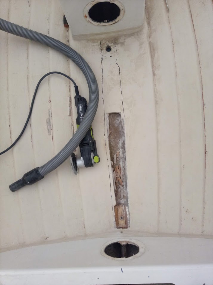 In true Prism fashion, we let the “while we are at it” project creep set in. After days of sanding, peeling, and grinding we found a few sections that were more damaged than we thought they were going to be. With Chris, Jons’ little brothers help, we laid up new layers of 1708 with epoxy, glassed-in support stringers, added an aft drain, and created a well/ bilge.