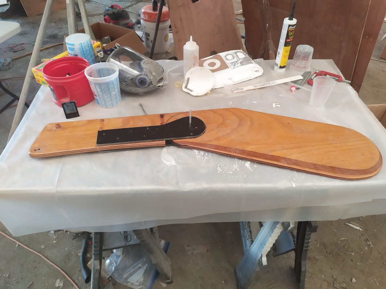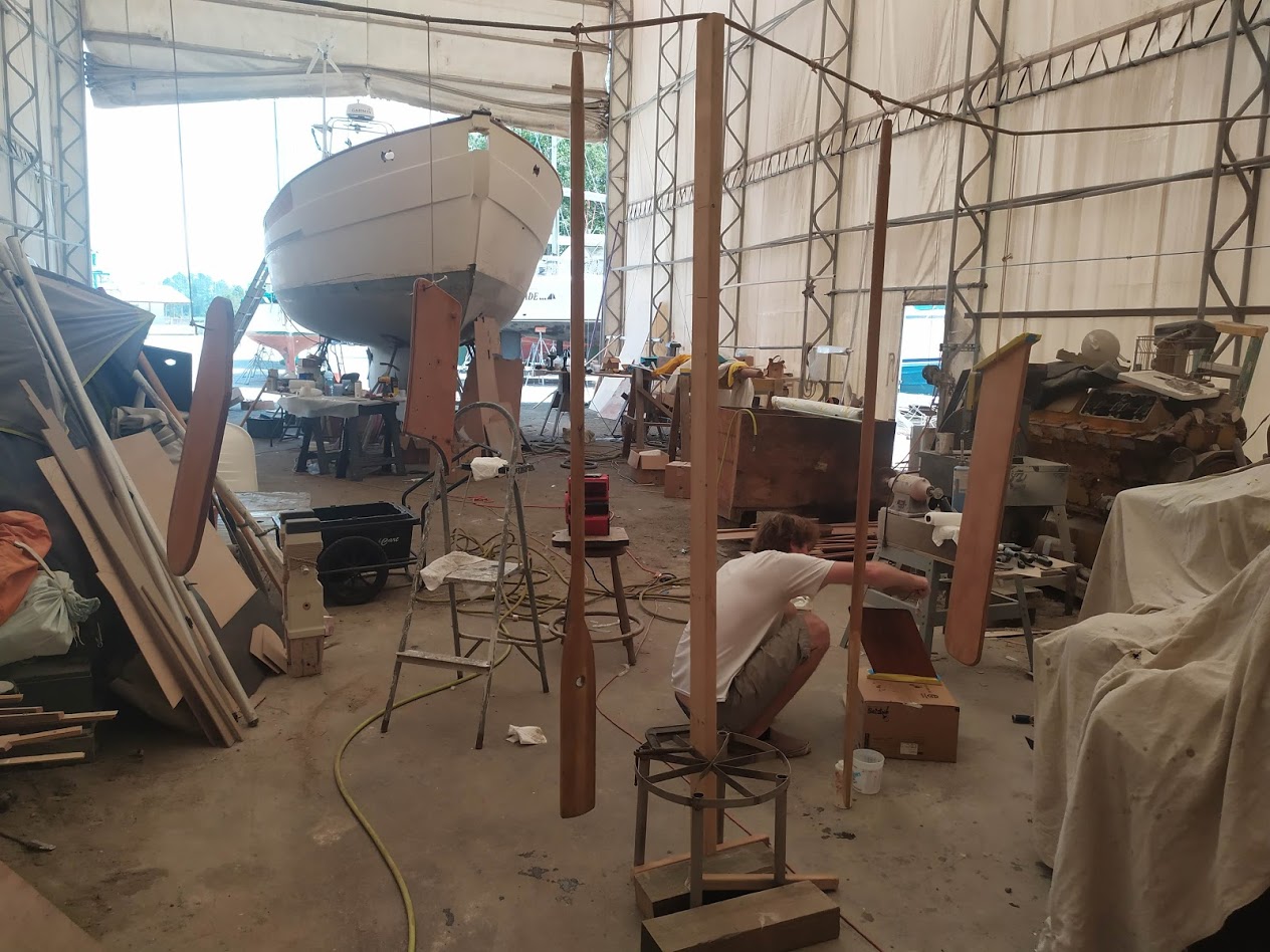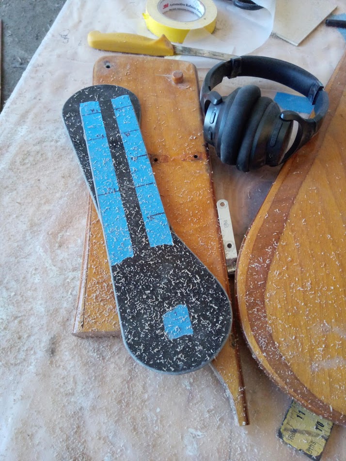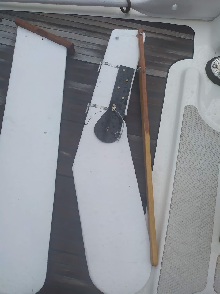 We let the Awlgrip cure for a few days, but kept busy turning the rudder into a folder rudder, painting the centerboard, plug, and oars.