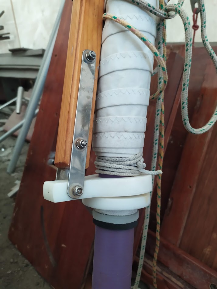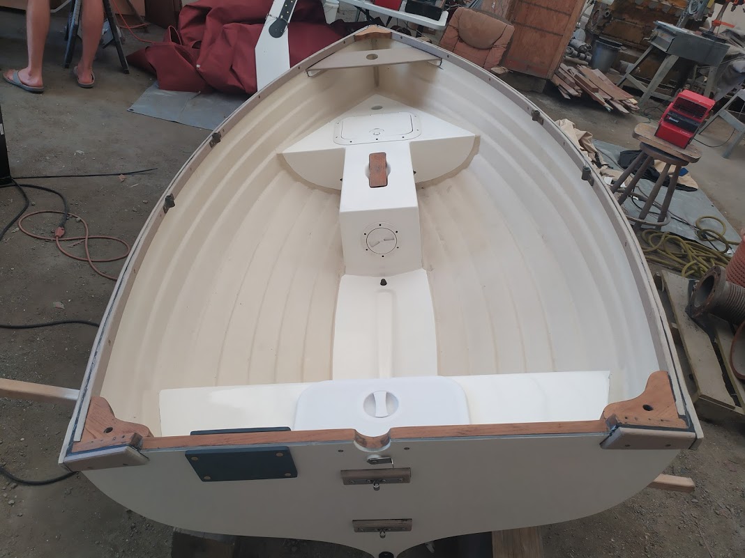 When the paint was dry, it was time to put the dinghy back together. We bought a synthetic wood to repace the cracked teak rails, used it for the mounting brackets for the rudder, and also for the mast support crossbeam that was orginally plywood. The final touch was adding the Dacron rub rail.