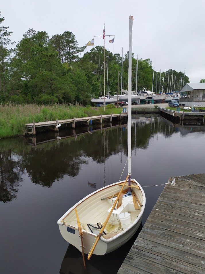 You would think that we would have launched the dinghy right away and sailed our faces off, but no. The newest member to our boat family sat dry and alone for over a week while we worked on the other HC33, Dragonquest. Finally, the temptation got to me while I was sanding the topsides. The weather was perfect outside, and the wind was blowing steadily along the Bay River. I looked over to Jon and said: “F this, let’s go sailing.” Jon all but literally dropped what he was doing and started to grab all the sailing attachments for the dinghy. We were down at the waters edge about 15 minutes later.