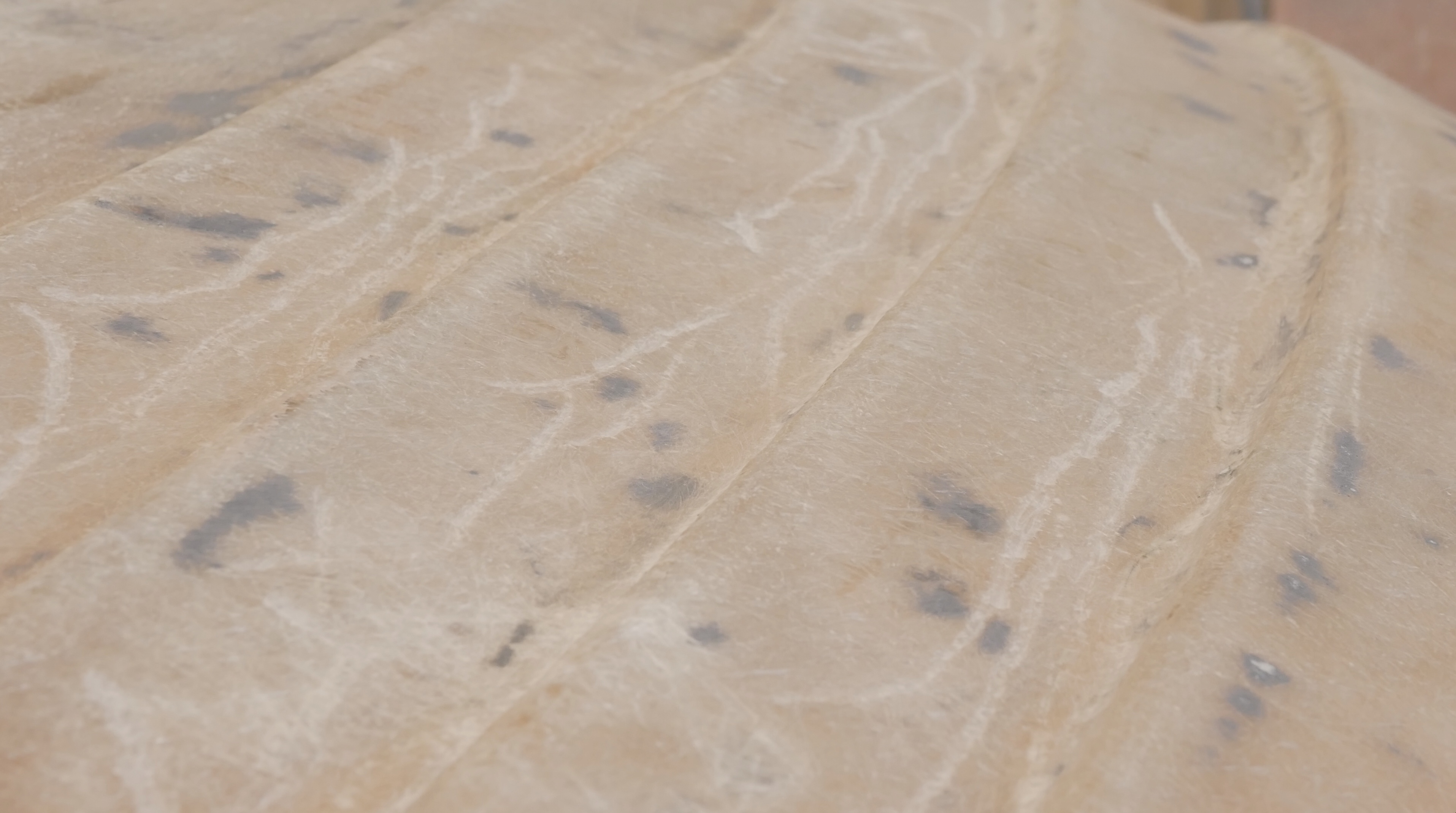 It all started with removing the old bottom paint. With the bottom paint gone, a mind field of Gelcoat cracks were exposed. What do you think Jons solution was? USE THE PEELER! Before I could stop him, or even before I had any idea what he was doing, our new dinghy was put under the “knife.” Jon’s reasons for the peeler where justified though, those cracks in the gelcoat where not just surface deep but in fact cracks in the laminate. Also the laminate had high levels of moisture content which when the gelcoat is removed it allows that to dry so we get a good bond for the repair. Luckily it was 1000 degrees in the tent so the laminate dried fairly quickly.
