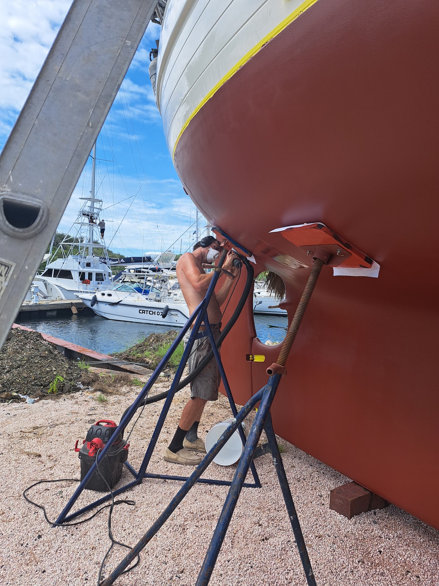 On Tuesday, Jon was over half way through burnishing the bottom ( in hopes that would “reactivate” the bottom paint) and I made the appointment to launch on Thursday morning 8am. A few hours later Jon came to me and said, “ I think we should just buy the cheap red paint and put on a coat, we will thank ourselves later”. Not one to ever argue with Jon ;)….. I was quick to agree and asked if we could reschedule our launch for Friday afternoon. The yard manager JJ said it would be no problem and we were good to go Friday at 1pm. Derek, Christina and I went on a run to get the paint called Nautical Pro Guard, it is a red Ablative and only cost $275.00 Gilder/ gal ( that’s less then $150USD). We were short on a few other painting supplies but a few more stops and we were all ready to set painting….tomorrow. The next morning (Wednesday) we were all at the yard, Jon had about a 1/4 left of the bottom to sand, so the rest of us started to put other things together. The anchor and chain were put back into place. Christina went up the mast to start running halyards, but that only lasted 5 minutes before JJ came running to tell us that people were not aloud aloft while on the hard. Understandable, but annoying as there was nothing else to do while we waited for Jon to be done with the sander.