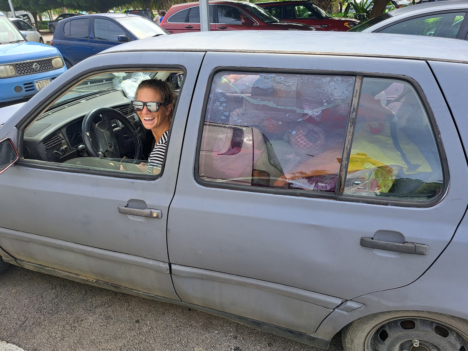 Now this is when it officially kicked in that we were back, our friend Derek pulled up in seriously the “Captain Ron” car (you know the one), beers in hand. The isolated thunderstorms made for the perfect color contrast for the plant life, birds and water color. BACK IN THE CARIBBEAN!!! Whoop whoop! The immediate appearance of sweat on my upper lip told me it was going to be a hot day and it was only going to get hotter. Derek and Christina were letting us stay aboard FIN while Prism was in the yard, but we did not need to take all our stuff back to their boat, so our first stop was Curaçao Marine to see Prism to drop off our stuff.