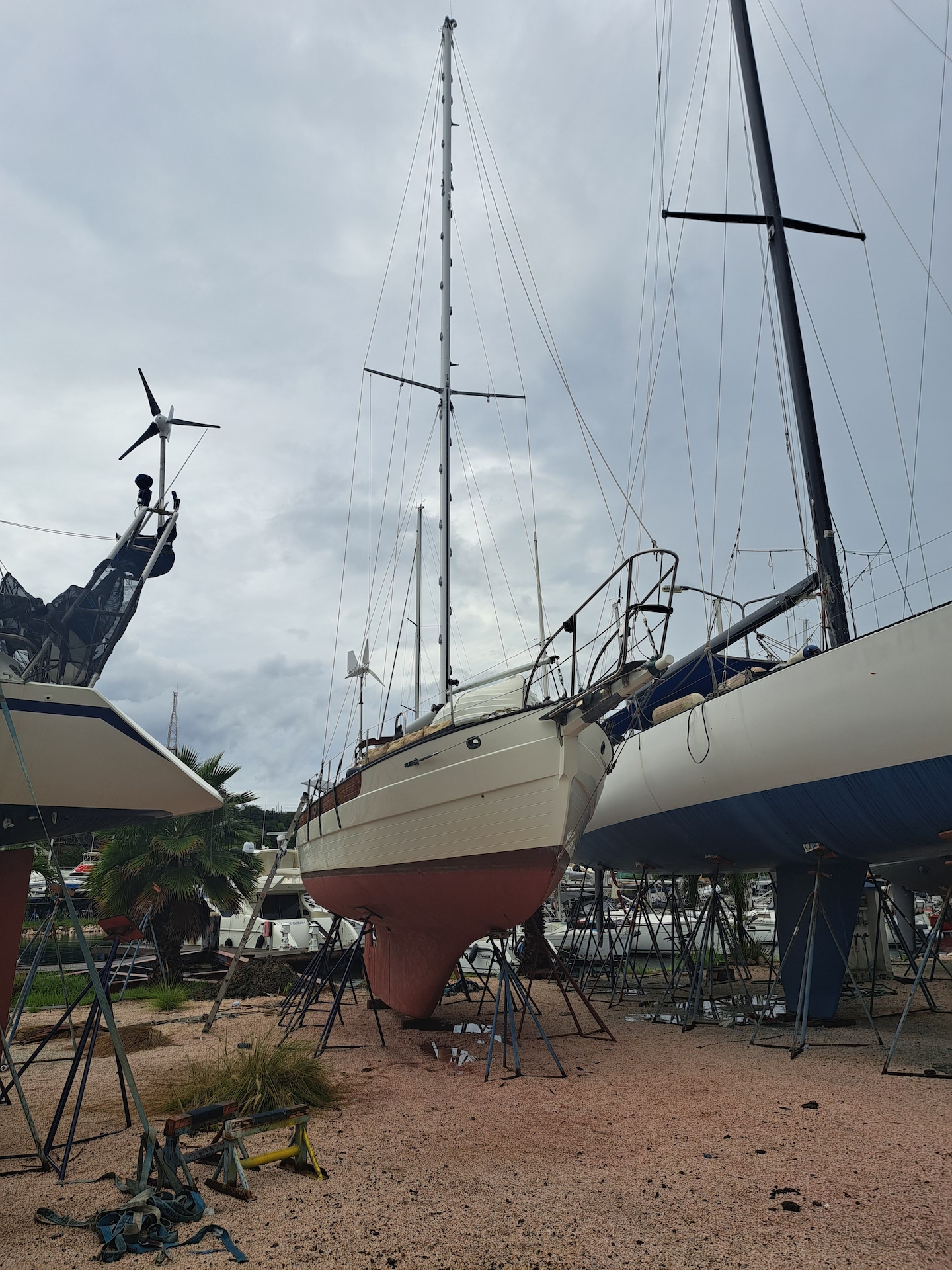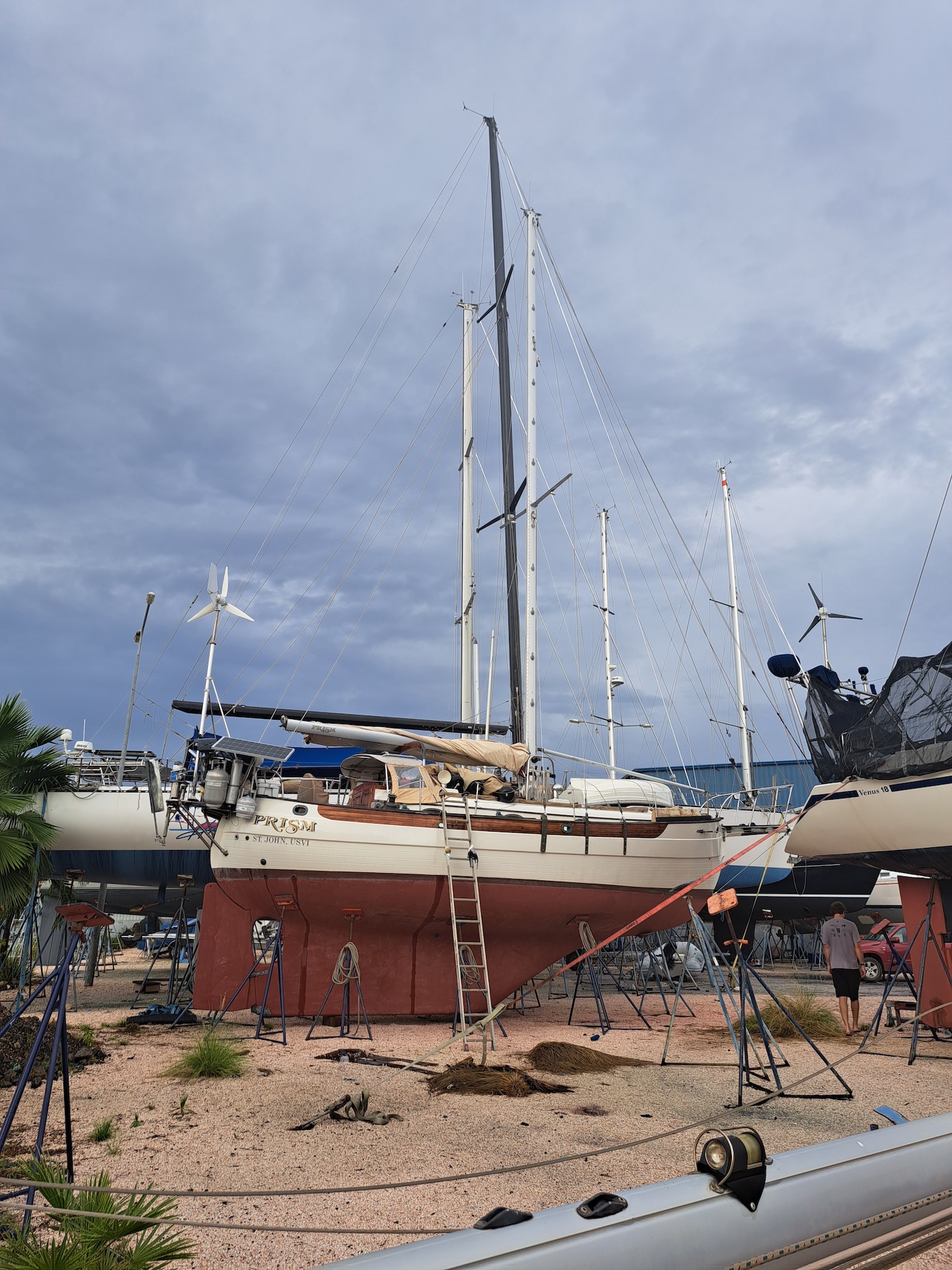 By 3ish the boat was sanded and we started to rinse, wipe and tape the water line. As soon as we were about to start applying, the dark line of a squall started to show its ugly face. Everyone in the yard said it was going to rain, but the 4 of us bet that it was going to miss us. We waited about 30 minutes to make sure we bet correctly and when it was clear the line was going to go to the south we all got to work! Jon was hopeful ( as he always is) that we would only need 1 gallon of paint ( though that is never the case). It is crazy how fast a bottom paint job goes when you have 4 people who know that they are doing. The first gallon got us more that 3/4 of the way, but it was not enough. So we opened the seconded and got 1 full coat on the bottom with a second along the water line and leading edges. We still had paint left over, so Jon and I would be back the next day to move the stands, paint those areas and apply more coats to the leading edges and water line until we were out of paint. Happy with the coverage, we were all set to launch Friday afternoon, hopefully with no set backs. A local friend of Christina and Dereks wanted to meet up with them on Friday, so the boys invited him to bring/sail Prism back to Spanish Waters after the launch.