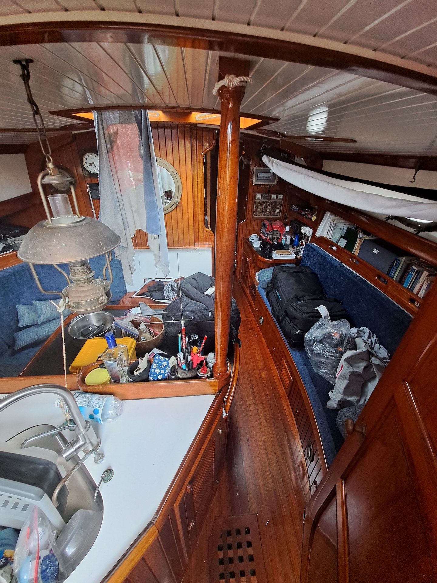 We climbed up into the cockpit and first thing Jon moved were the dock lines that were tossed into the well as we departed during the haul-out process. As he lifted higher, the amount of movement on the teak was slightly terrifying. Once they were identified as little black ants scurrying off with their white larva in tow, Jon and I went on a stomping spree in hopes that they were only in the cockpit and that we did not have an ant infestation inside. Once we opened the companionway we were relived to see nothing move inside and there was no damp smell. Phew! We did however notice one very dry and dead cockroach, and what looked like mice droppings. Rut row!