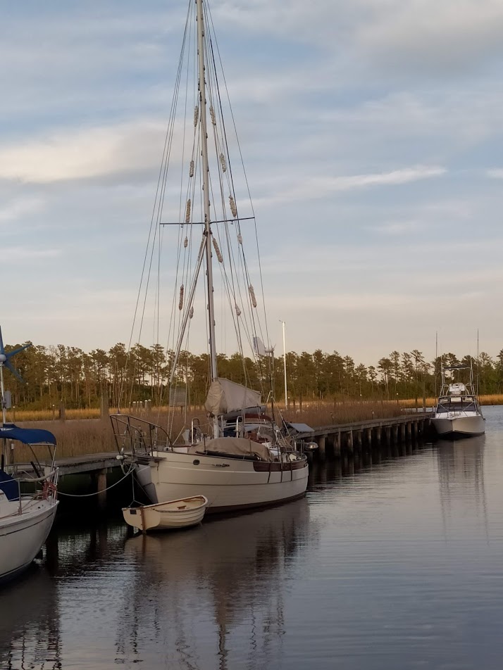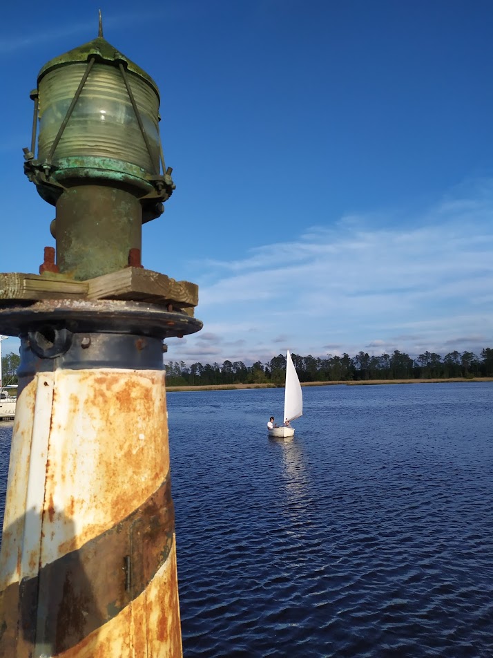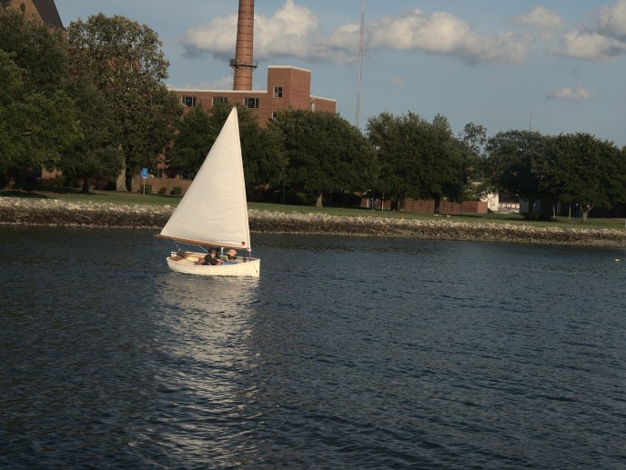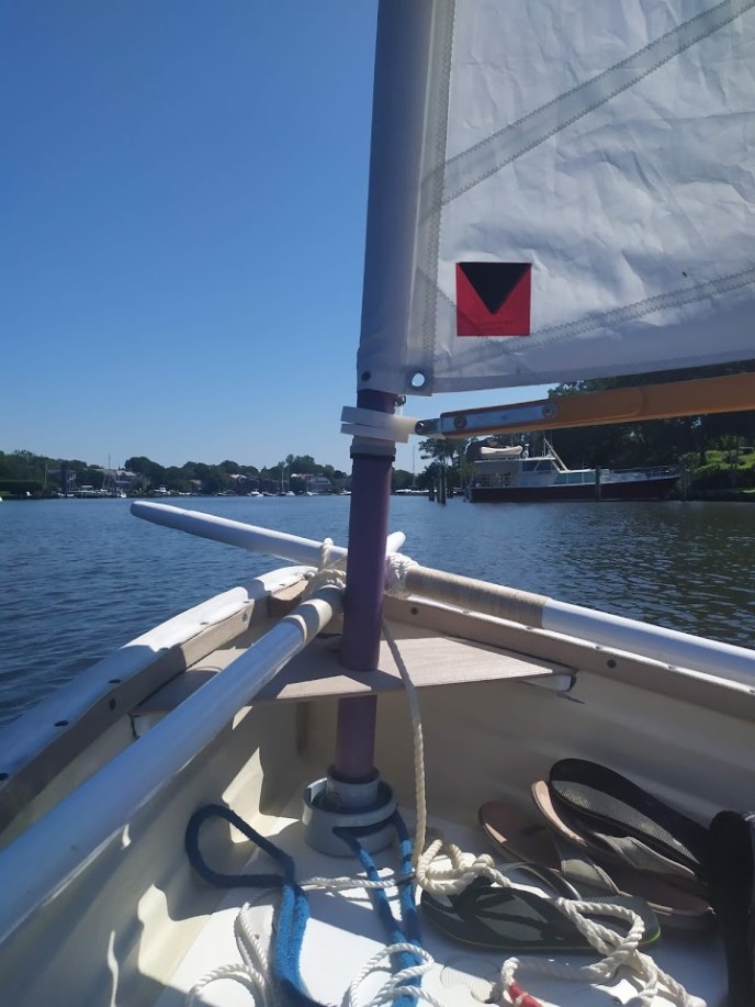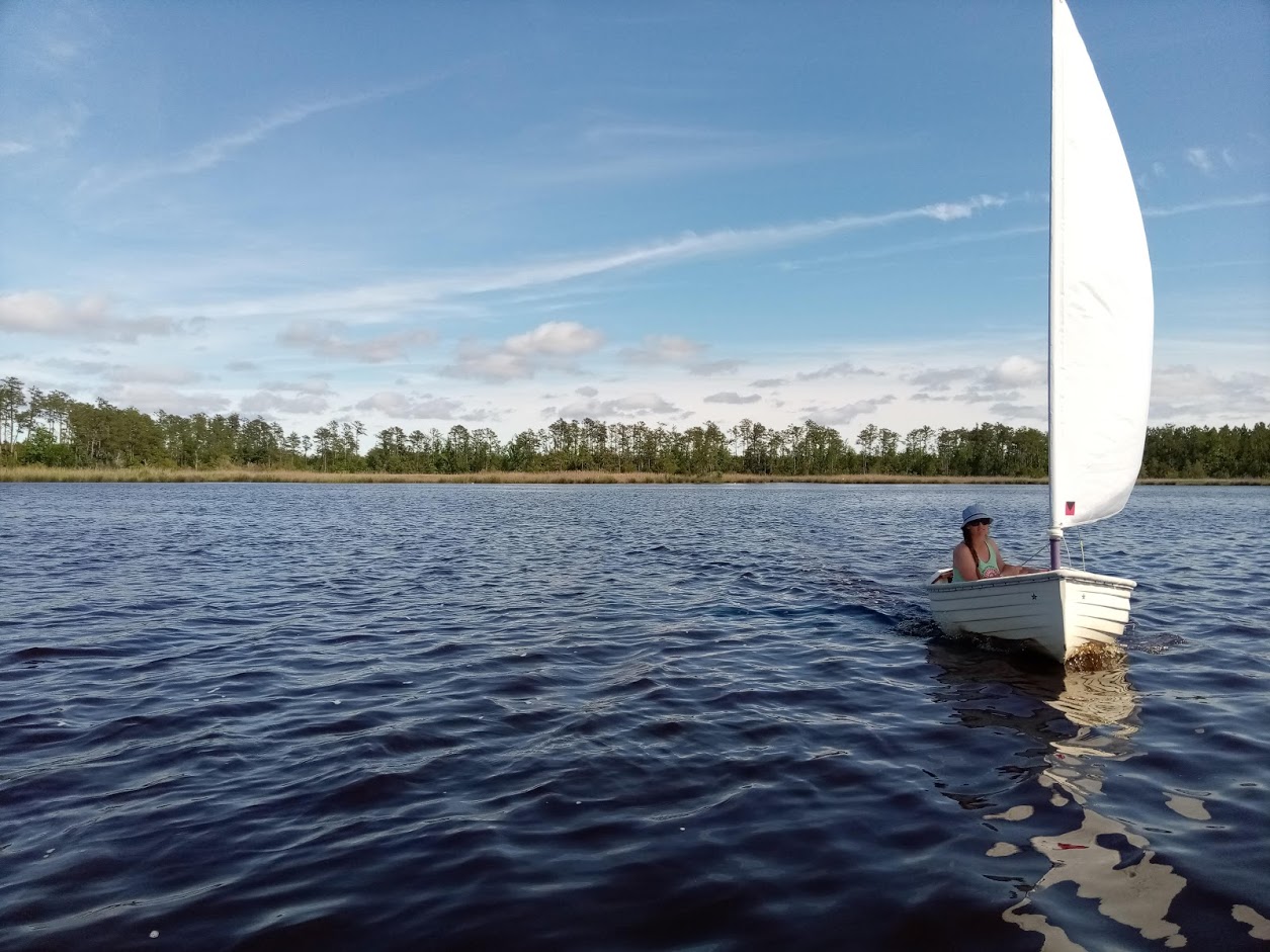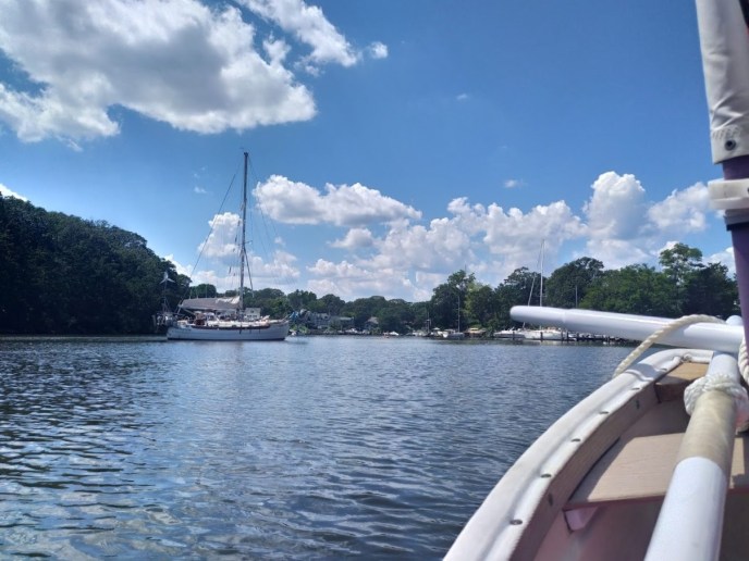 You would think that we would have launched the dinghy right away and sailed our faces off, but no. The newest member to our boat family sat dry and alone for over a week while we worked on the other HC33, Dragonquest. Finally, the temptation got to me while I was sanding the topsides. The weather was perfect outside, and the wind was blowing steadily along the Bay River. I looked over to Jon and said: “F this, let’s go sailing.” Jon all but literally dropped what he was doing and started to grab all the sailing attachments for the dinghy. We were down at the waters edge about 15 minutes later.