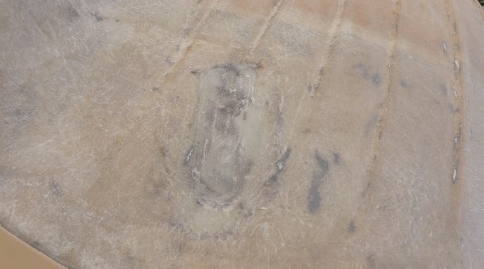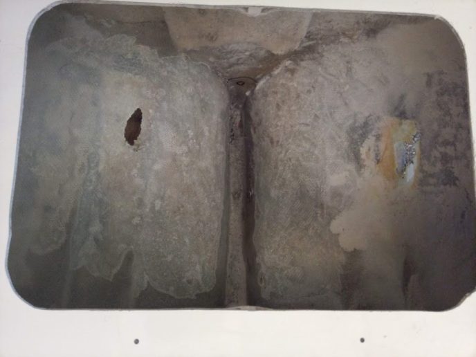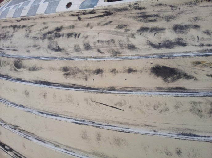It all started with removing the old bottom paint. With the bottom paint gone, a mind field of Gelcoat cracks were exposed. What do you think Jons solution was? USE THE PEELER! Before I could stop him, or even before I had any idea what he was doing, our new dinghy was put under the “knife.” Jon’s reasons for the peeler where justified though, those cracks in the gelcoat where not just surface deep but in fact cracks in the laminate. Also the laminate had high levels of moisture content which when the gelcoat is removed it allows that to dry so we get a good bond for the repair. Luckily it was 1000 degrees in the tent so the laminate dried fairly quickly.