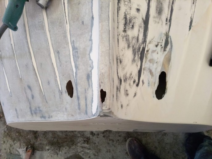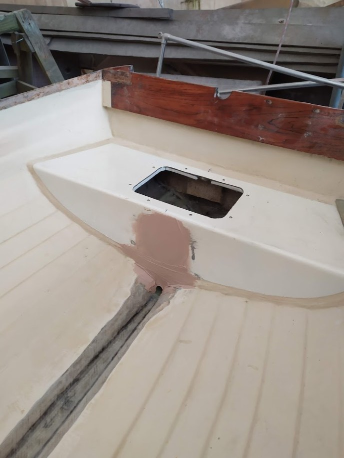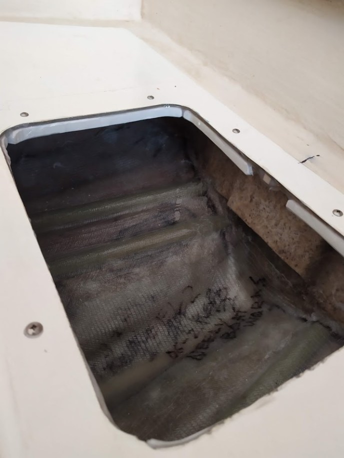In true Prism fashion, we let the “while we are at it” project creep set in. After days of sanding, peeling, and grinding we found a few sections that were more damaged than we thought they were going to be. With Chris, Jons’ little brothers help, we laid up new layers of 1708 with epoxy, glassed-in support stringers, added an aft drain, and created a well/ bilge.