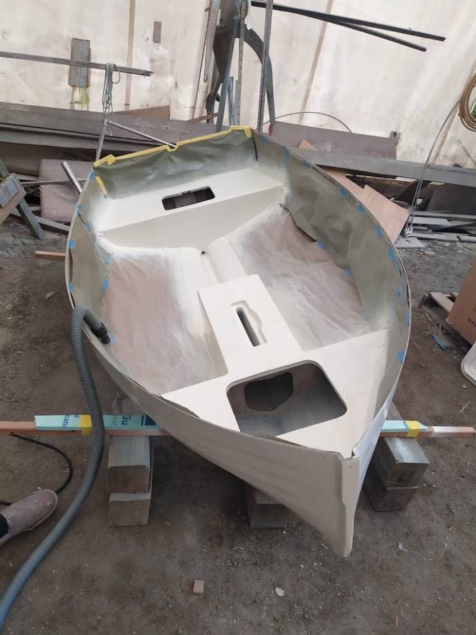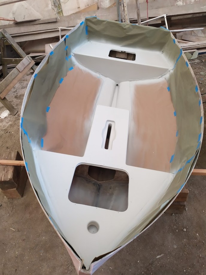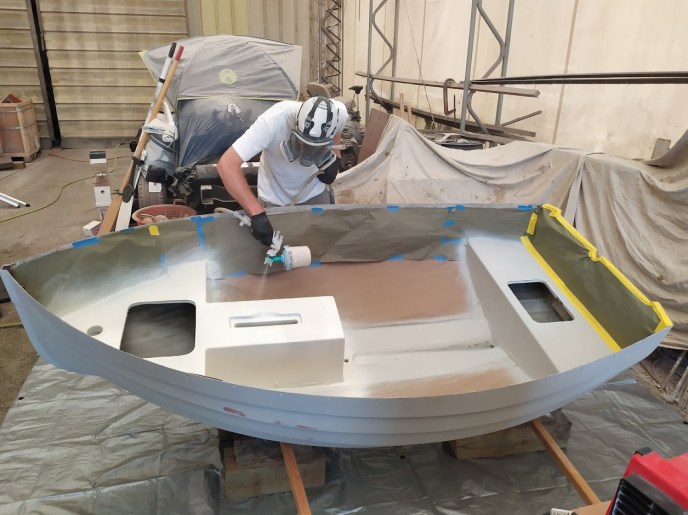 The cream paint on the inside of the dinghy was in good shape, so we left that alone. The outside hull got the full treatment of an epoxy barrier coat, a topcoat of Awlgrip Oyster White, and the same goes for the seats and the center line on the inside.