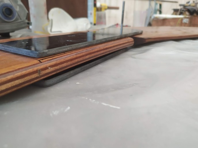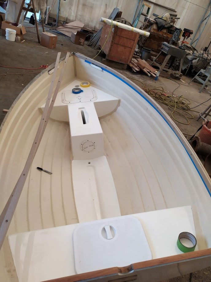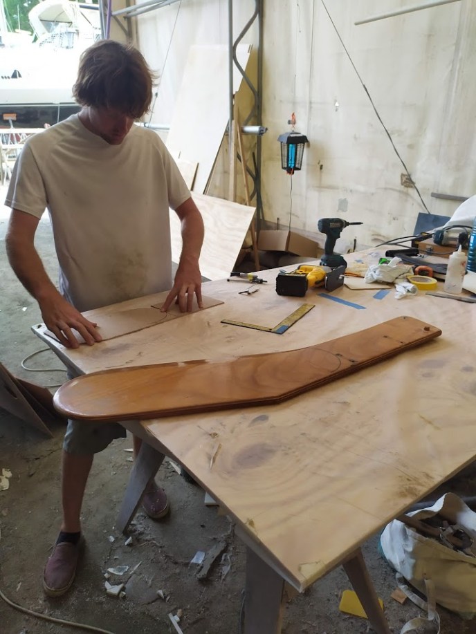 We let the Awlgrip cure for a few days, but kept busy turning the rudder into a folder rudder, painting the centerboard, plug, and oars.