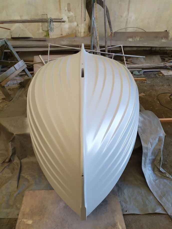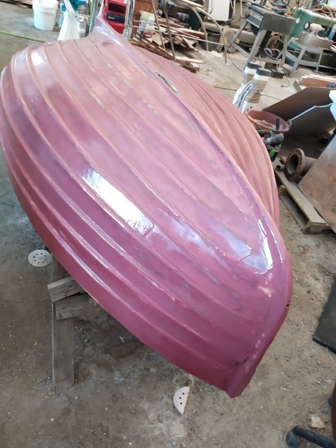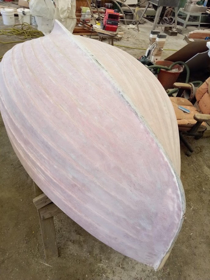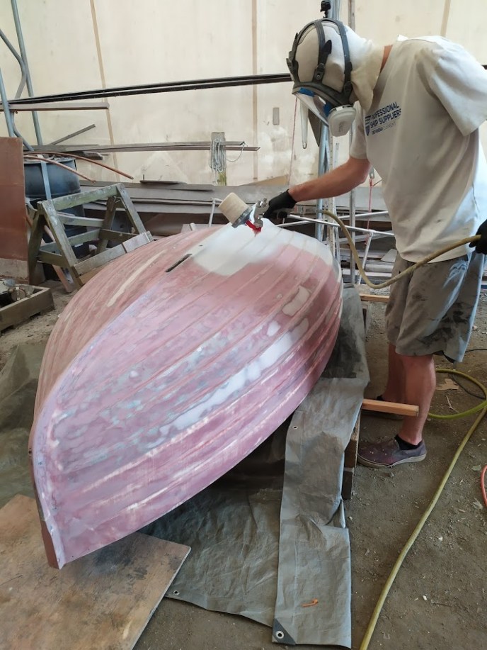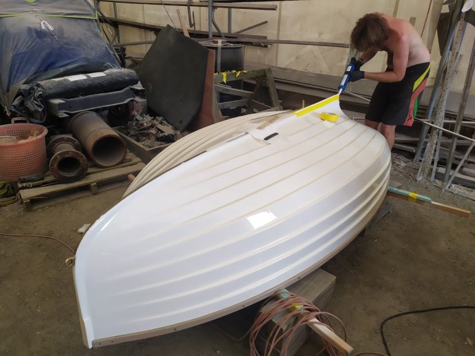 Once all the inside repairs were done, Jon and I flipped her over. We then laid up two layers of 6oz biaxial where the peel had been performed, then one layer of 17oz over the entire hull followed by lots of fairing compound. It definitely took some finesse to get the material to contour to the lapstrake hull, however, with enough thickened epoxy, we made it work. Once the epoxy had cured, I spent the next few days filling, fairing, and long-boarding my heart out. Who knew an 8-foot dinghy could be so big? I felt like it was never going to end. It eventually was as smooth as a babies bottom and ready for paint.