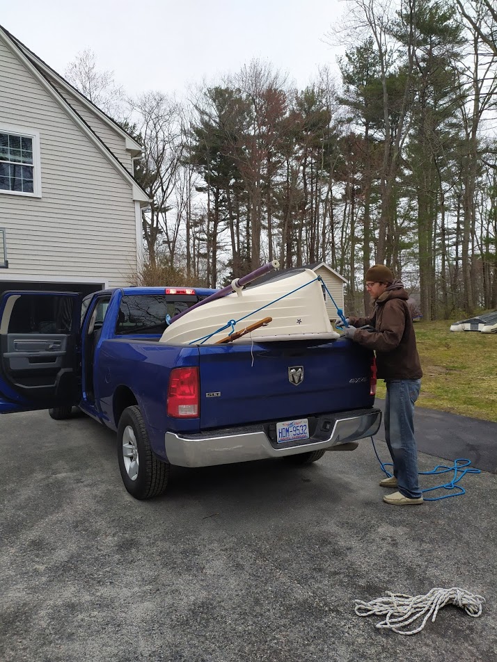 Let me break down our 3 crazy days of picking up this dinghy. First up, we needed to rent a truck, but most rental places are closed. Lucky for us, the New Bern airport was still renting cars, and they had one truck left in the lot. ONE! We looked real flashy driving up interstate 95 in the shiny 2019 royal blue Dodge RAM. Not gonna lie, for being a Ford fan, I liked this truck. It drove like a dream, our butts and legs never went to sleep or anything, and we drove straight to Maine from North Carolina in one day. That was over 18 hours of driving, during a pandemic. Jon and I wore our masks, washed our hands religiously, and took care to keep our interaction with anyone to a minimum. Which was easy to do, as no one was out and about. Seriously, the roads were empty. The rest stops and visitor centers along the highway were all but abandoned, which made using the restrooms easy and our interactions with others a nonissue. Before we left, we decided not to drive through NY city, as it was the hot spot of the country for Covid-19 at that time. So we opted to drive up and out towards Albany, then cut across to Maine. This route also avoided all the mother f*ing tolls that NY has. I mean WTF New York, seriously, a total of $68 in tolls to drive through, one way! Ridiculous. During our 18 hour drive, Jon said he was going to finish editing episode #34, but the power socket would not work. At your first stop to fill up with gas, he even took out the fuse box to see if that was the problem. However, it was not, so you will all have to keep waiting for him to finish #34.