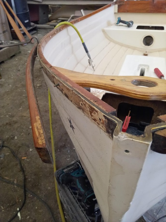 When the paint was dry, it was time to put the dinghy back together. We bought a synthetic wood to repace the cracked teak rails, used it for the mounting brackets for the rudder, and also for the mast support crossbeam that was orginally plywood. The final touch was adding the Dacron rub rail.