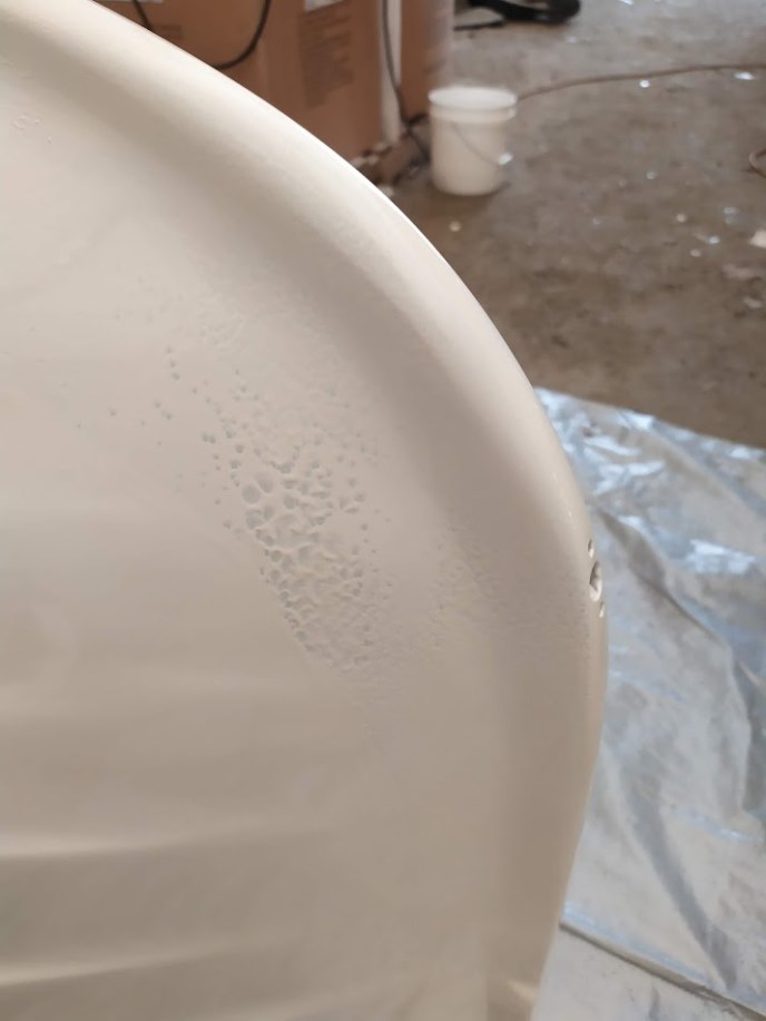 The STBD side went without a hitch, but for some reason, the Port bow threw in a wild card. CONTAMINATION! During the final wipe down we must have missed a section that had oil or something on it. AHHH! Well, it is just a working dinghy. So, we quickly wiped it down with the reducer, cleaned up the edges as much as we could then continued to spray the Awlgrip. To our surprise, the boo-boo on the port bow somehow did not end up sticking out like a sore thumb.