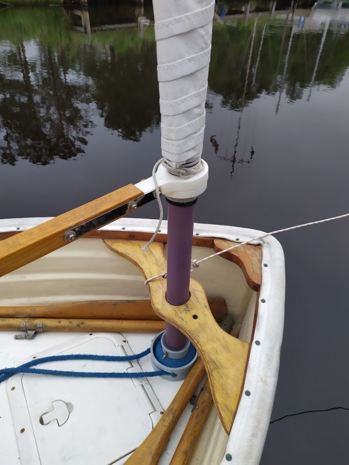 4. Hello. I was lucky to find my own Fatty Knees sailing dinghy. It is quite old, had new gelcoat and interior paint done about 8 years ago, then put in storage. It sails great, but I have a few issues. First is water in the forward compartment. It seems to be coming from the centerboard trunk. I dont see any cracks or other places it could be entering. Any ideas on how to get in there and repair? I have quite a bit of experience with composite airplanes and so am OK with cutting and replacing foam, doing layups, sanding, etc. Second – I love your furling system. Can you share the components you used and any other instructions on making this? Do you still have battens in the sail?